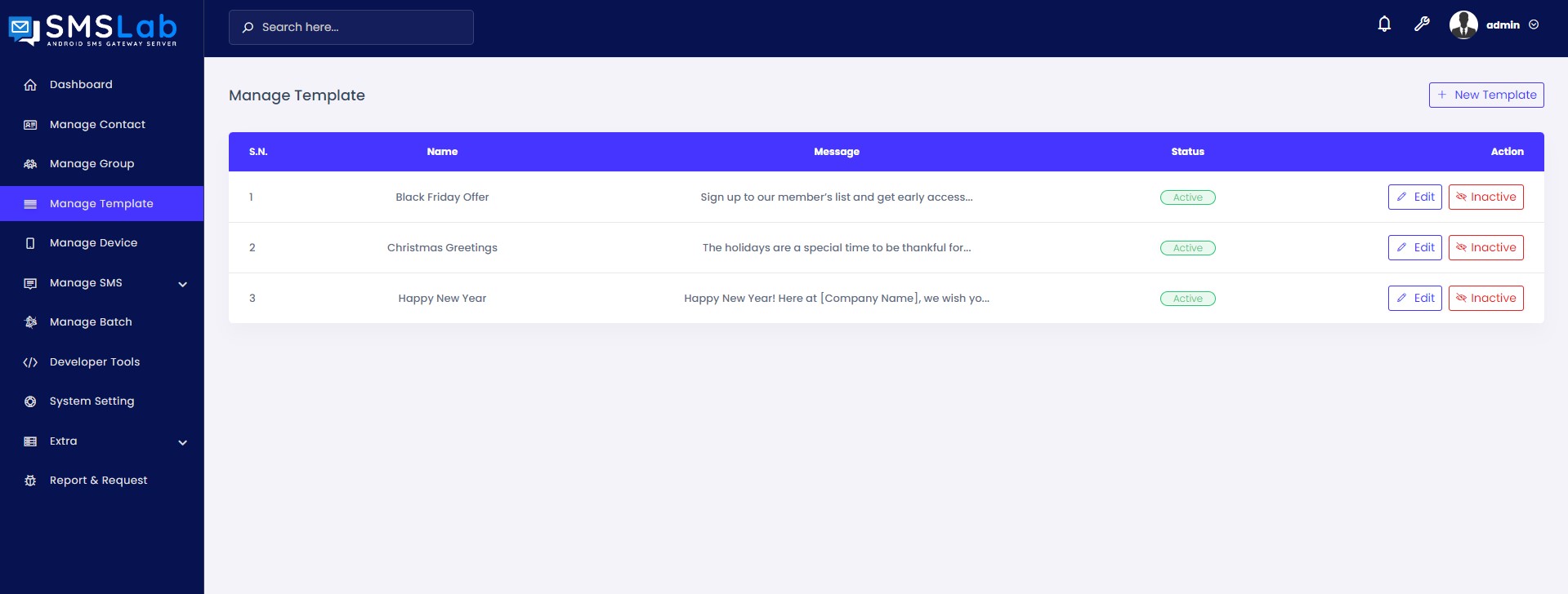 - Manage SMS Template.