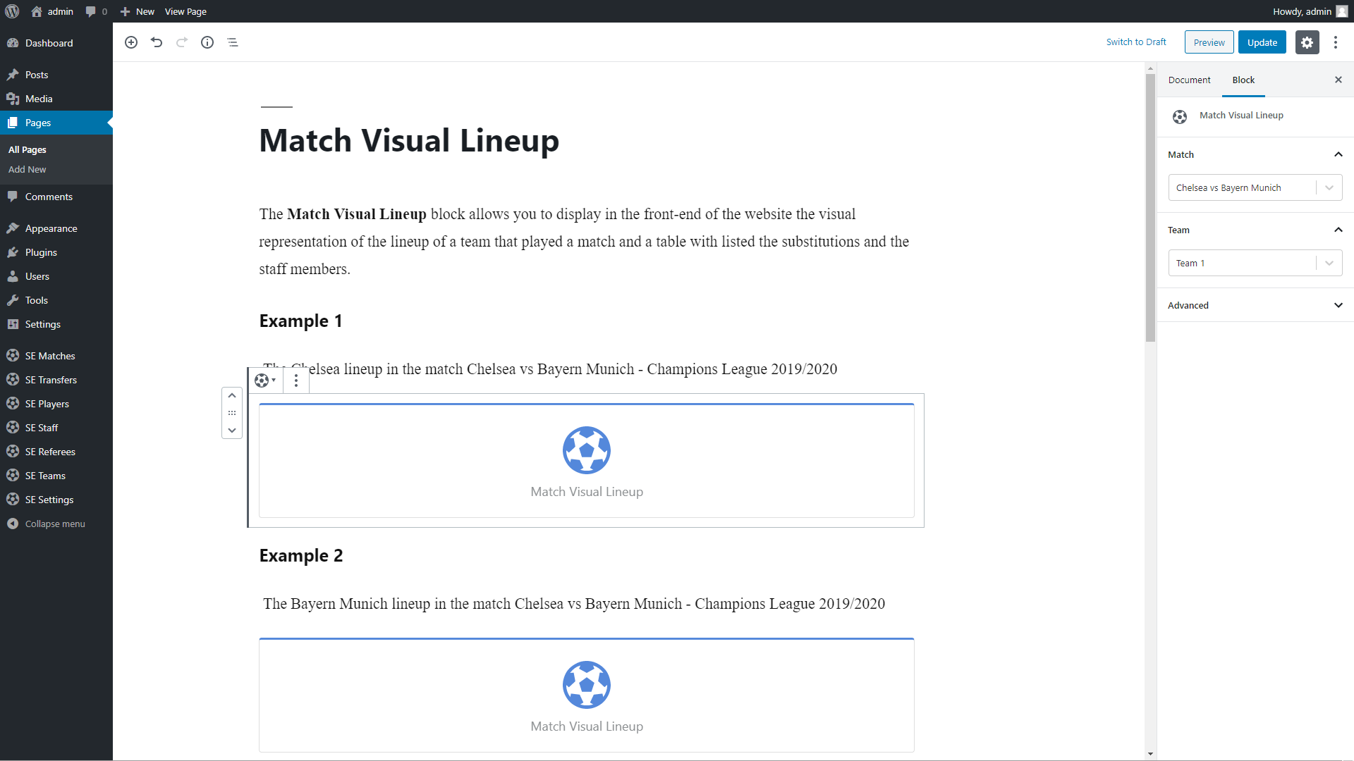 The Soccer Engine plugin is able to generate tables to display the stored data (22 blocks are available for this purpose), tables with generated statistics (E.g. Referee Statistics by Competition, Referee Statistics by Team), custom layouts for specific purposes (E.g. Match Timeline, Match Commentary, Player Summary, Staff Summary, Referee Summary), standings tables (E.g. Competition Standings Table), charts (E.g. Market Value Transitions Chart, Ranking Transitions Chart) and graphical representations based on the provided data (E.g. Visual Match Lineup).