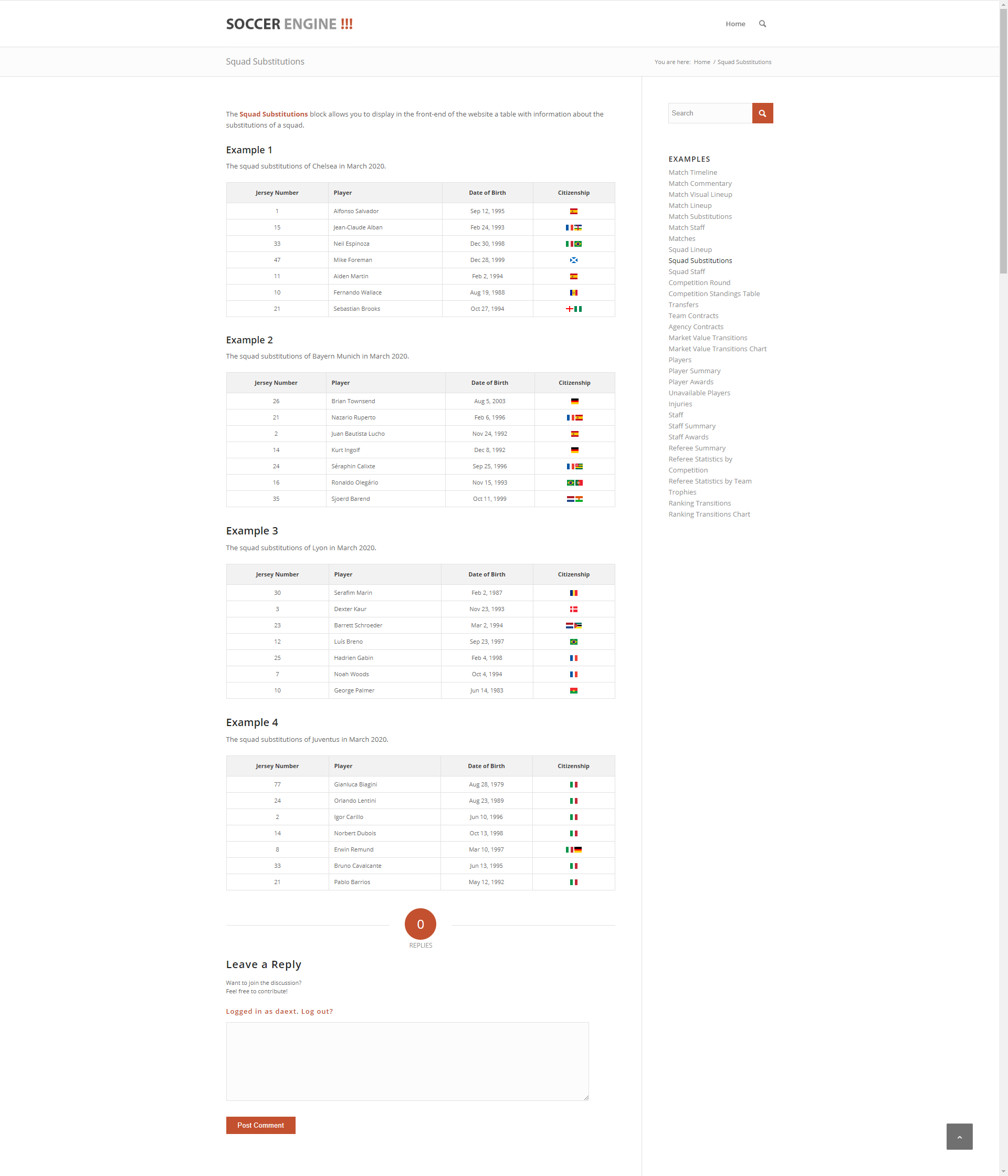 - This item presentation and the demo website make use of real names and logos of teams, competitions, trophies, and player agencies with the only purpose of creating the proper context to expose the plugin capabilities. If you are the owner of a brand listed in this item presentation or the demo website and you want to remove it, please contact us at support@daext.com
