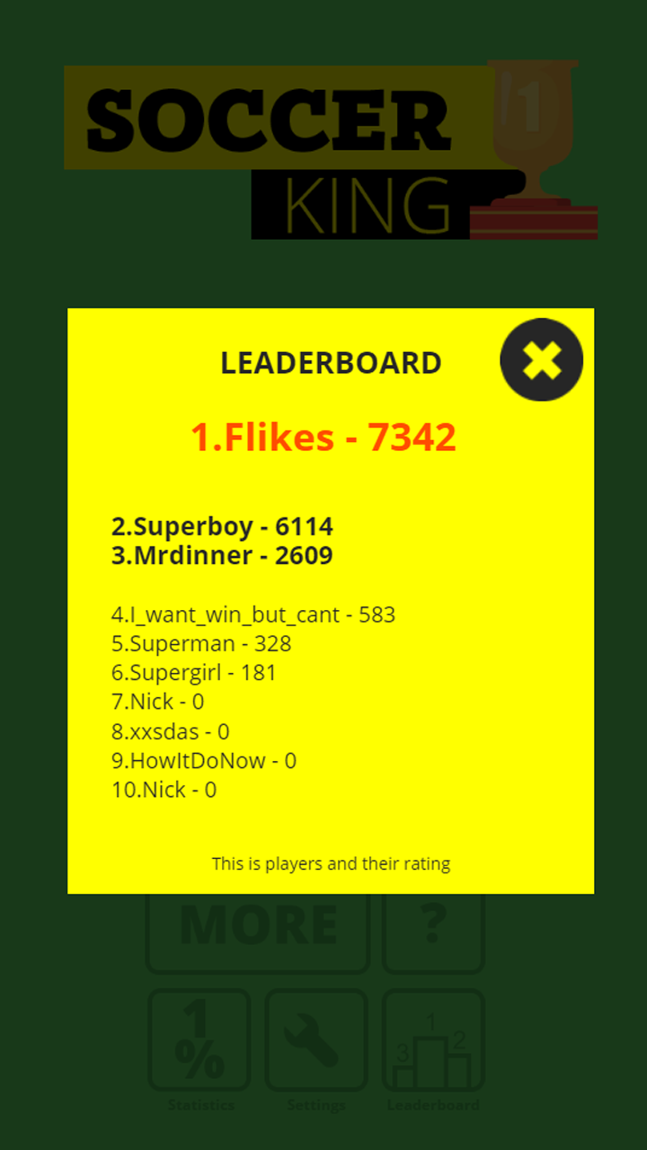 - Server part. Here is we collect and saving players data. Columns in database is: id, nickname, rating, hits, targetHits, wins, games, playerID and authKEY. Nothing personal. Player just register in automode in the game. Then he can play with another players. Also you can transfer player progress. For this just copy player ID and put it into another device.