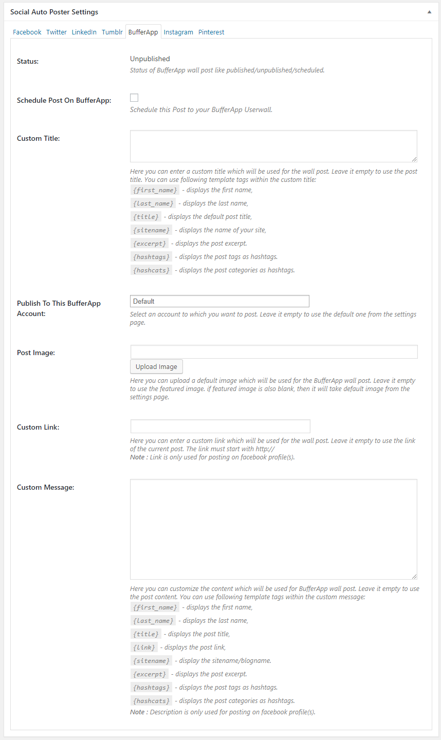 - It’s a time saver – Automatically shares your Posts/Pages/Custom Post Types to all major Social Media Platforms (Facebook, Twitter, LinkedIn, , Tumblr, BufferApp, Instagram and pinterest).