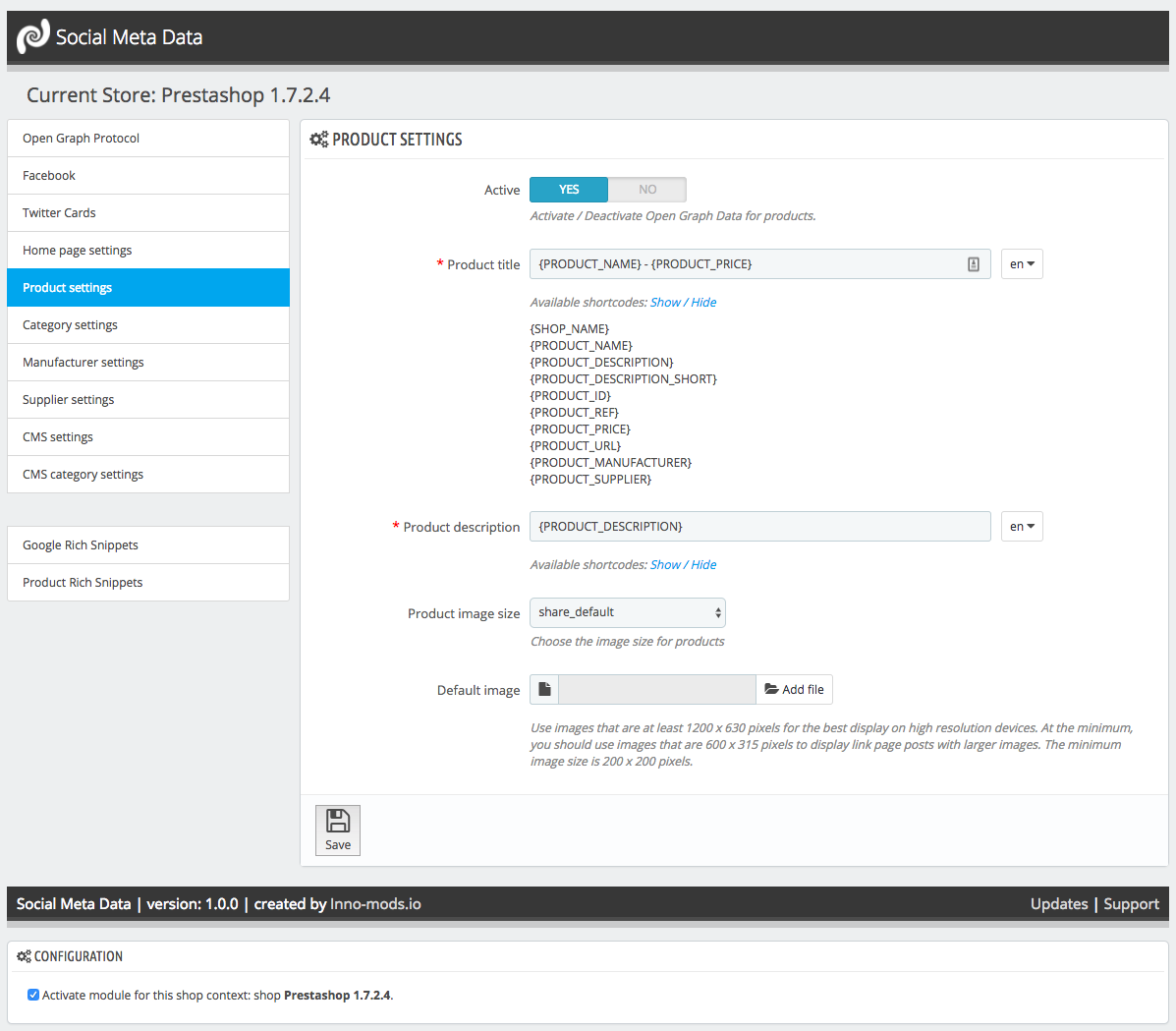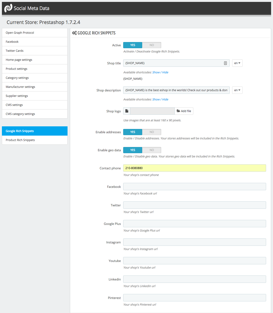 Social Meta Data is a premium, multi-shop and multi-language Prestashop plugin than allows you to insert mata data for major social networks in order to fully customize the way your shared content appears!