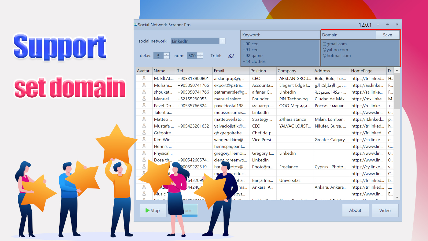 Social Network Data Scraper can help with gathering large amount of data for you and used for lead generation campaigns. Using the automatic extraction feature that is available on almost all the extractors, such data can be gathered quickly and accurately.