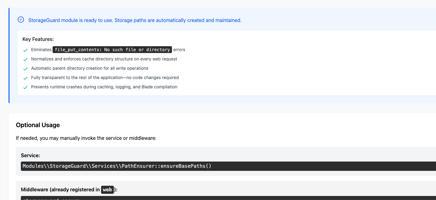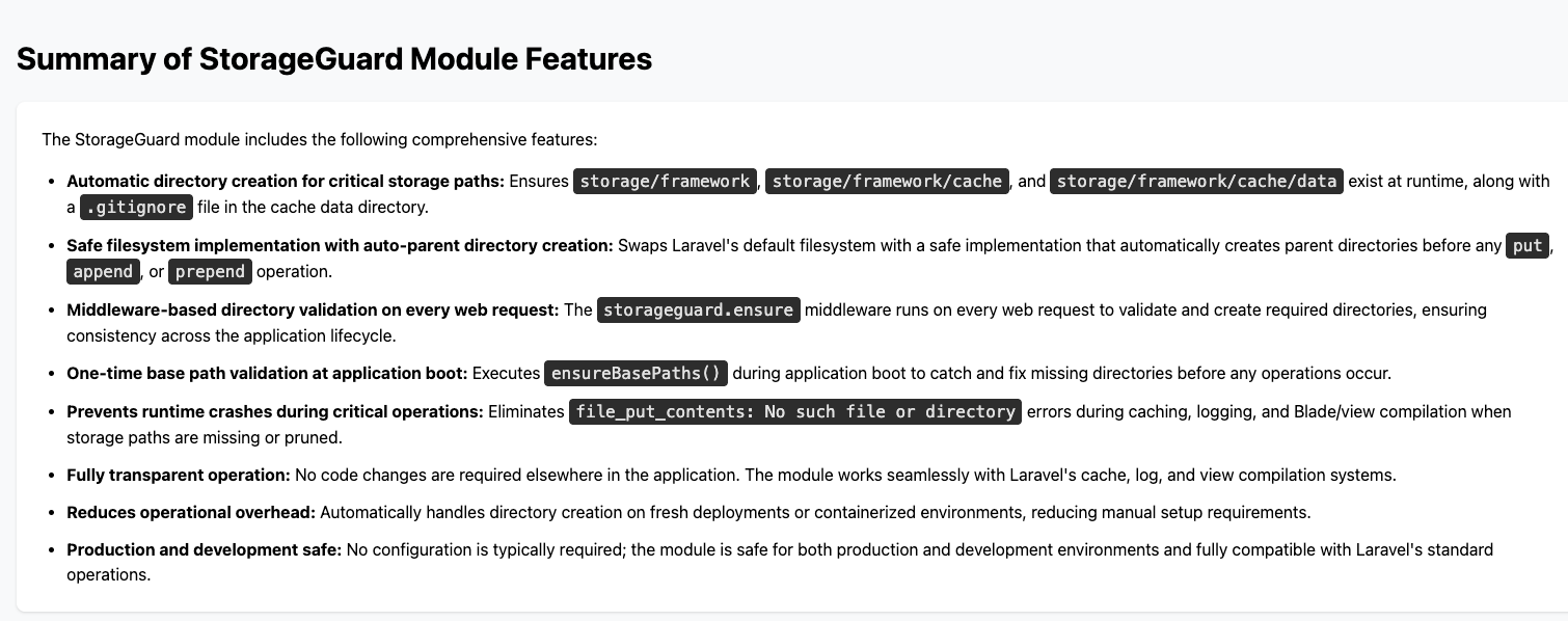 The StorageGuard Module provides a robust safety layer for Laravel applications, ensuring all critical storage and cache directories exist at runtime. This prevents common errors like file_put_contents: No such file or directory by automatically creating required storage paths (such as storage/framework, storage/framework/cache/data, and more) whenever your app or Laravel’s filesystem needs them. StorageGuard transparently wraps Laravel’s filesystem and cache write operations for maximum reliability, even after deployments, cache clears, or in fresh container environments.