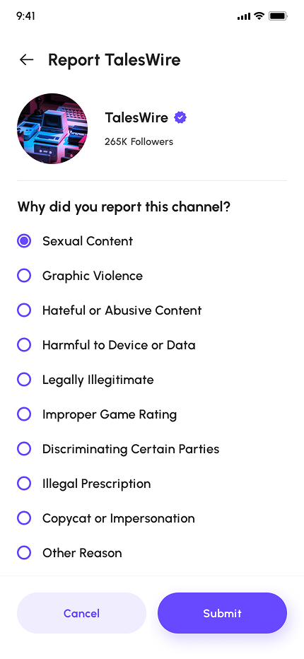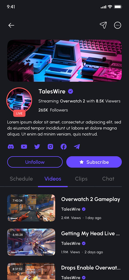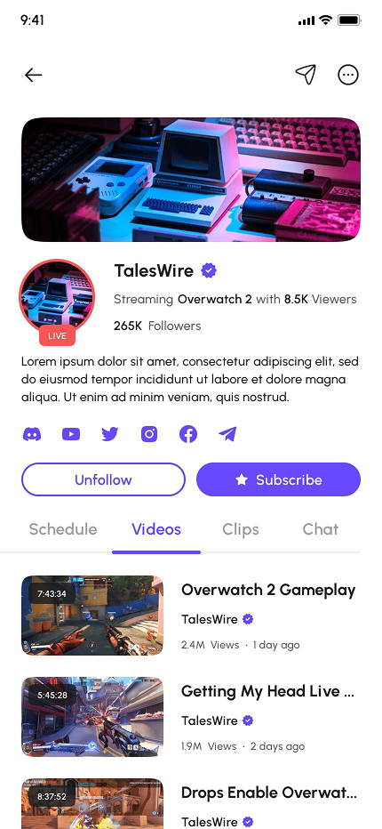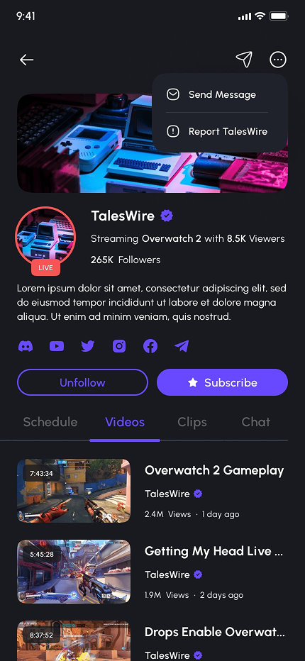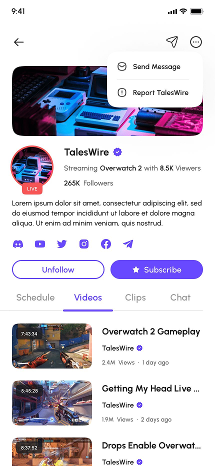 - Channel Profiles (Home, About, Scheduled Live Stream, Videos, Clips, Chat, Share, Report, & More)