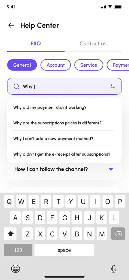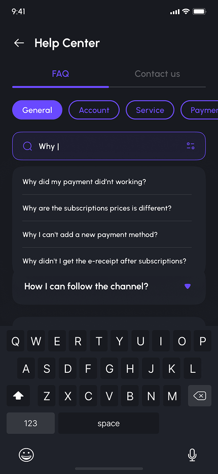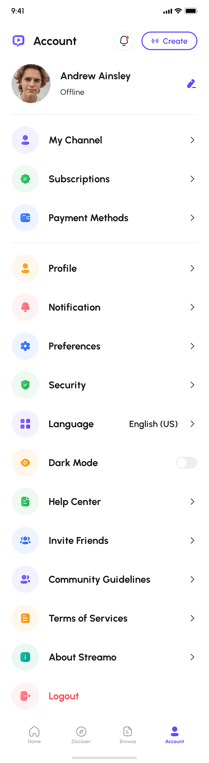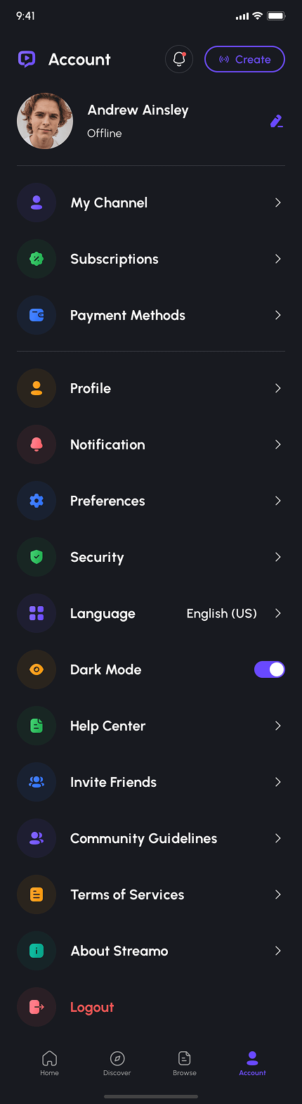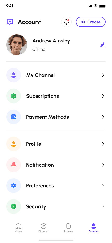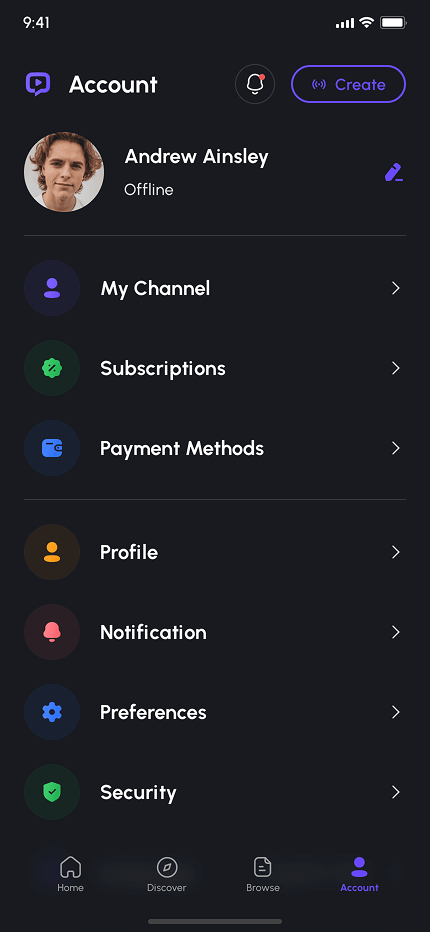 - Account & Settings (My Channel, Payment Methods, Subscriptions, Preferences, Profile, Notification, Security, Language, Invite Friends, Help Center, About, & More)