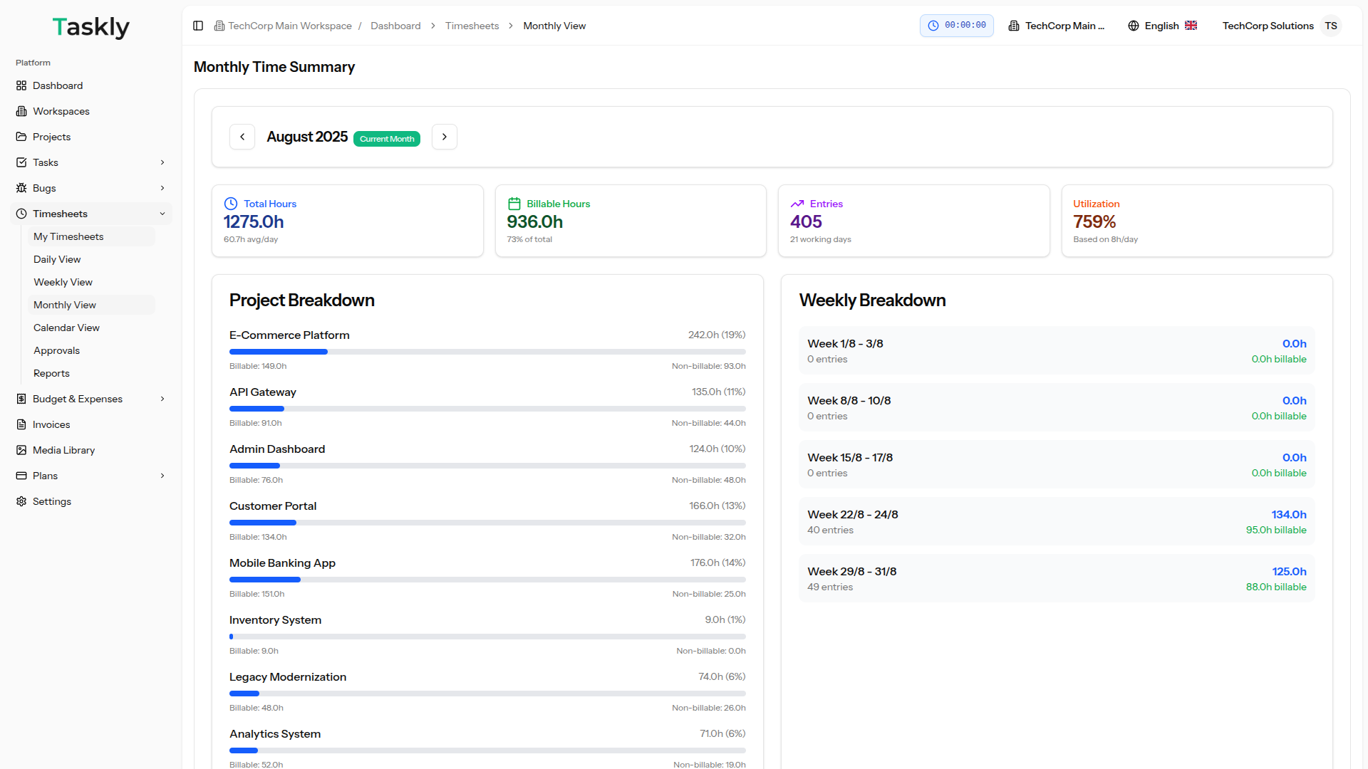 Built-in smart timer with project and task association for accurate time logging. Automated timesheet generation with approval workflows and manager oversight. Billable hours tracking with client invoicing integration. Calendar view with day/week/month reporting and visual timeline representation.Smart Budget & Expense Management