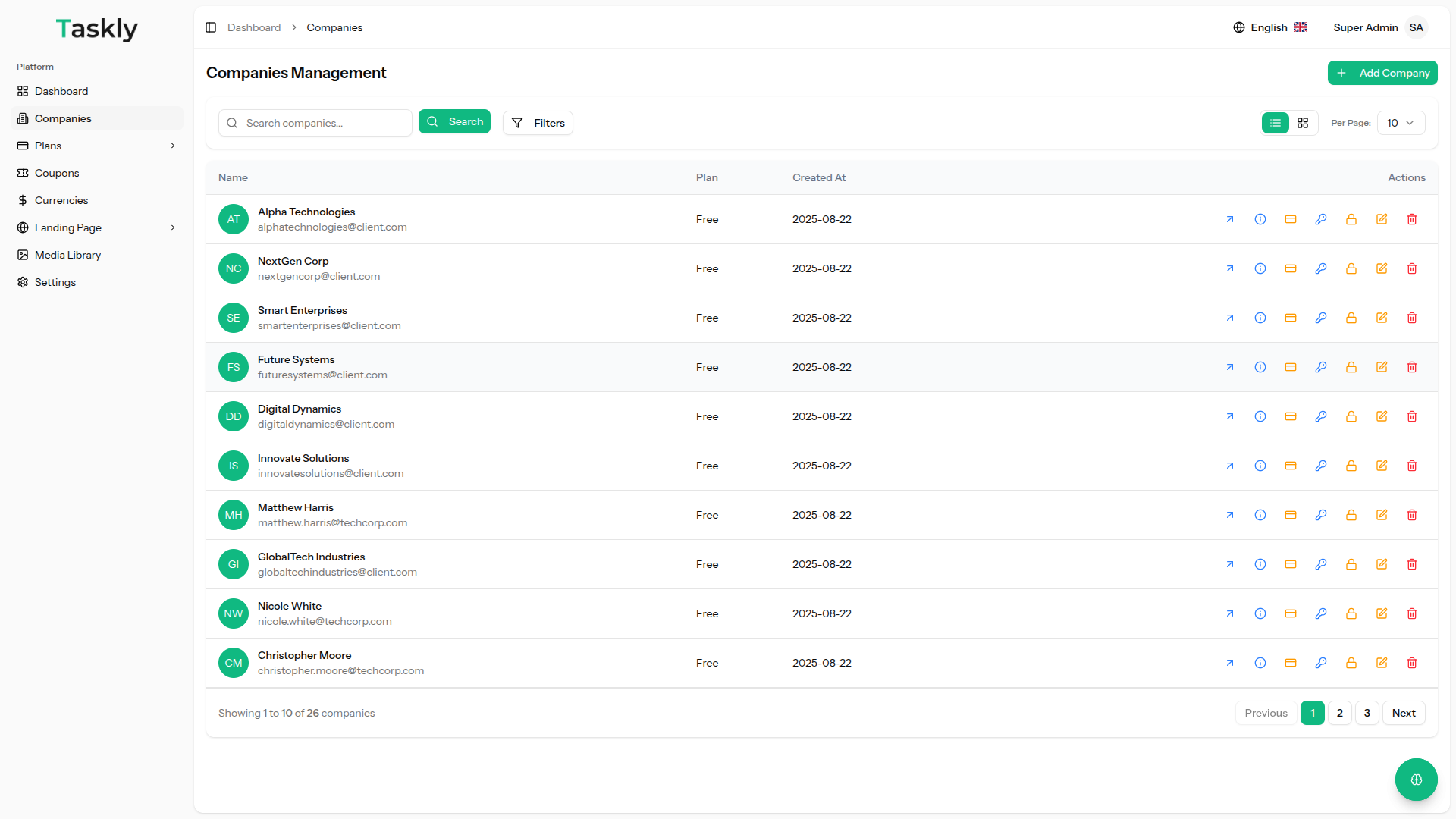 Support for 30+ payment gateways, including Stripe, PayPal, Razorpay, Cashfree, Mollie, and regional providers. Secure payment processing management. Multi-currency support with real-time exchange rates and payment analytics.Multi-Language & Global Support