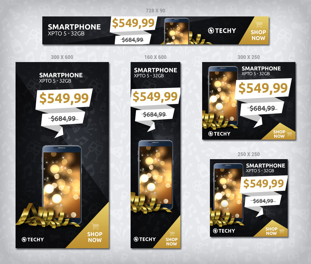 Techy it’s a HTML5 Ad Template, designed to promote your brand, products, services and your amazing special offers in a quick and easy way. The Ad was built with Google Web Designer (free software by Google) and it’s fully prepared to be used in DoubleClick or Google Adwords display network campaigns. With this HTML5 Ad Template, you get 4 different animated banner designs in 5 standard ad sizes that you can easily edit in Google Web Designer. All the files needed to edit the ads are included, as well as 20 PSD files (Completely layered and well organized), so you can completely customize your ads according to your brand and campaign needs.What’s Included with Techy – Holiday Sales HTML5 Banner Template: