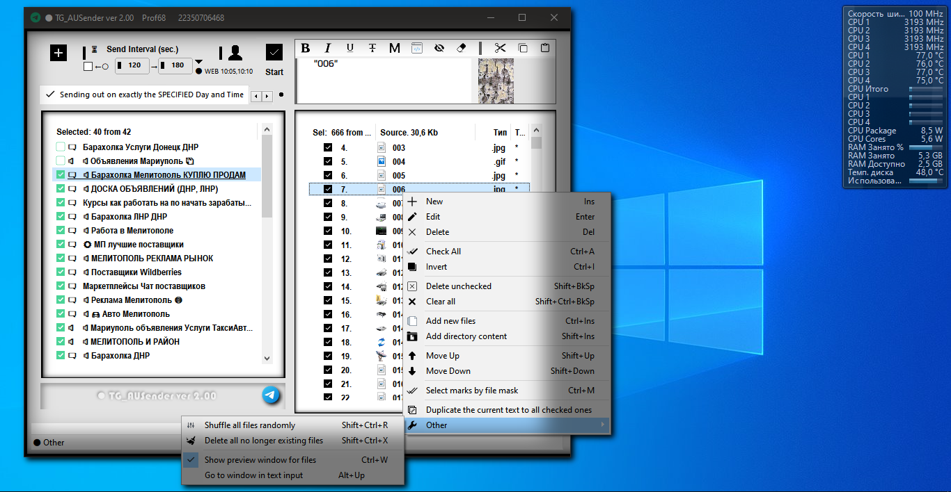 In a nutshell, there are a lot of ways to use the program. You can assign entire sets of such rules, with different times, files, and text for each recipient. There’s no limit to the number of such recipients. Change the order of transmission, text, and other settings quickly and intuitively. All the changes you make are saved on the fly for greater convenience when working with the program. This also applies to your other Telegram accounts connected to the program. Each of them can have its own set of files and rules. Switch between them in 1 click or run them simultaneously and in parallel. Run as many of accounts simultaneously as there is enough free RAM on your system.