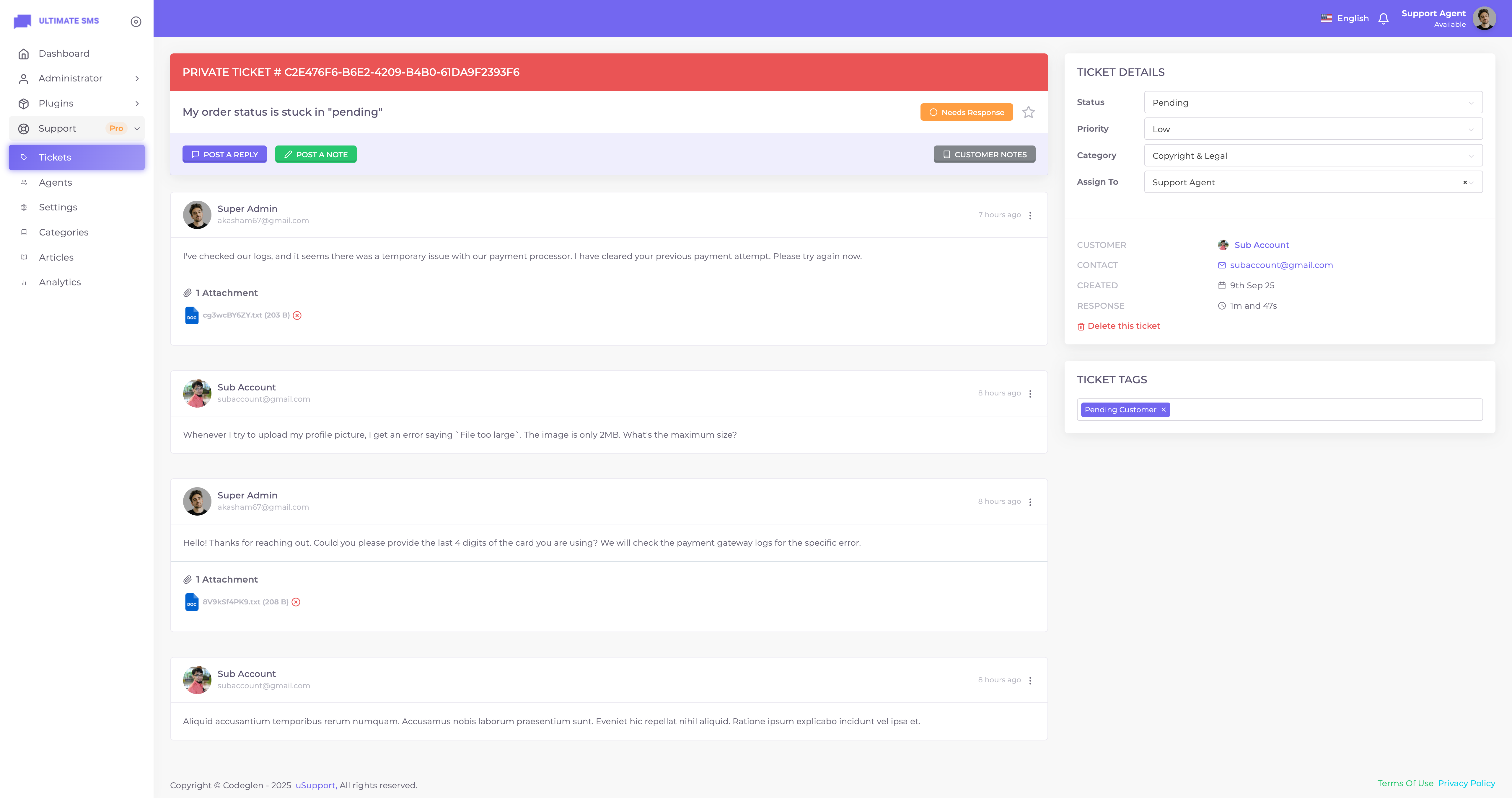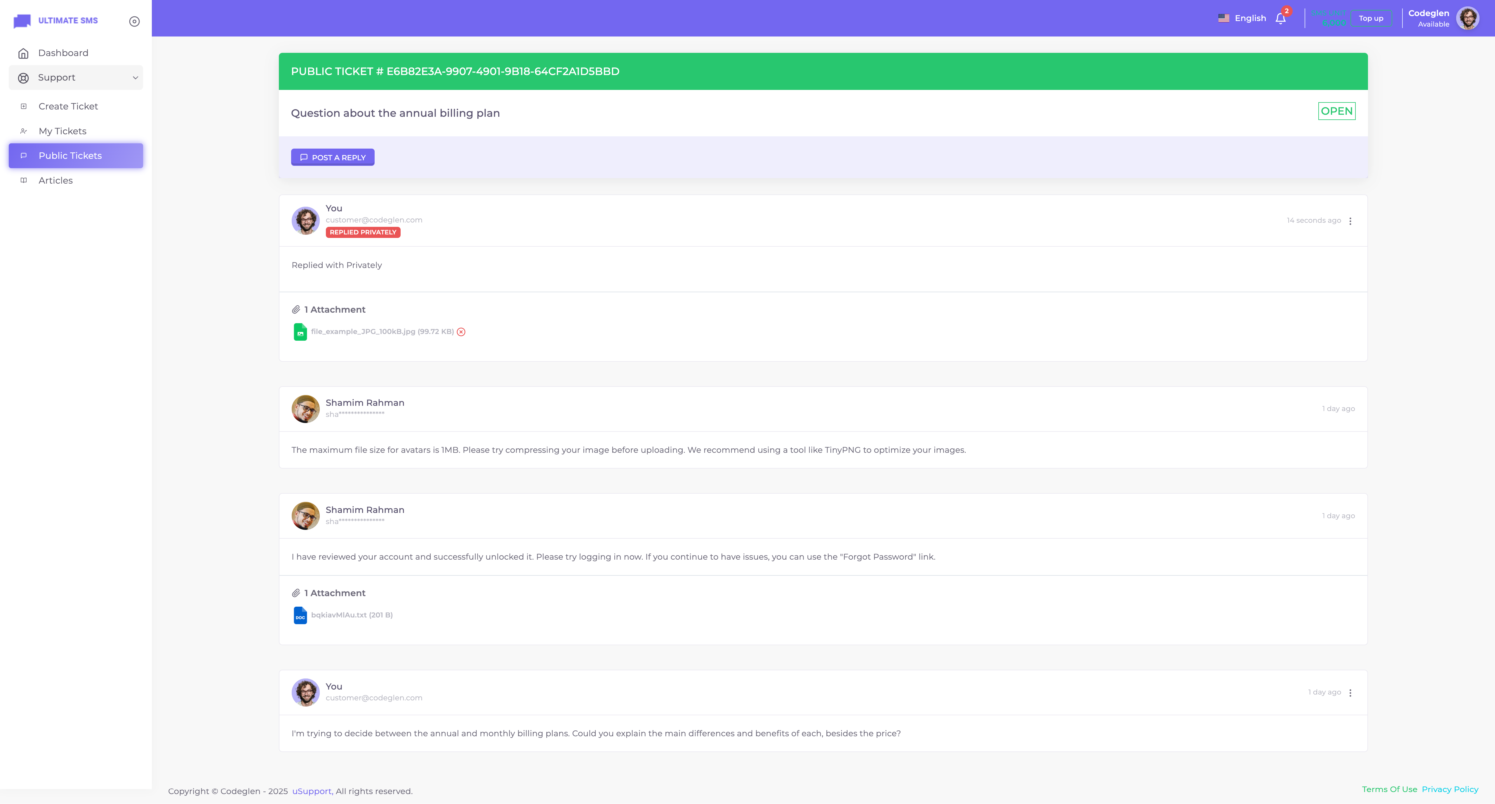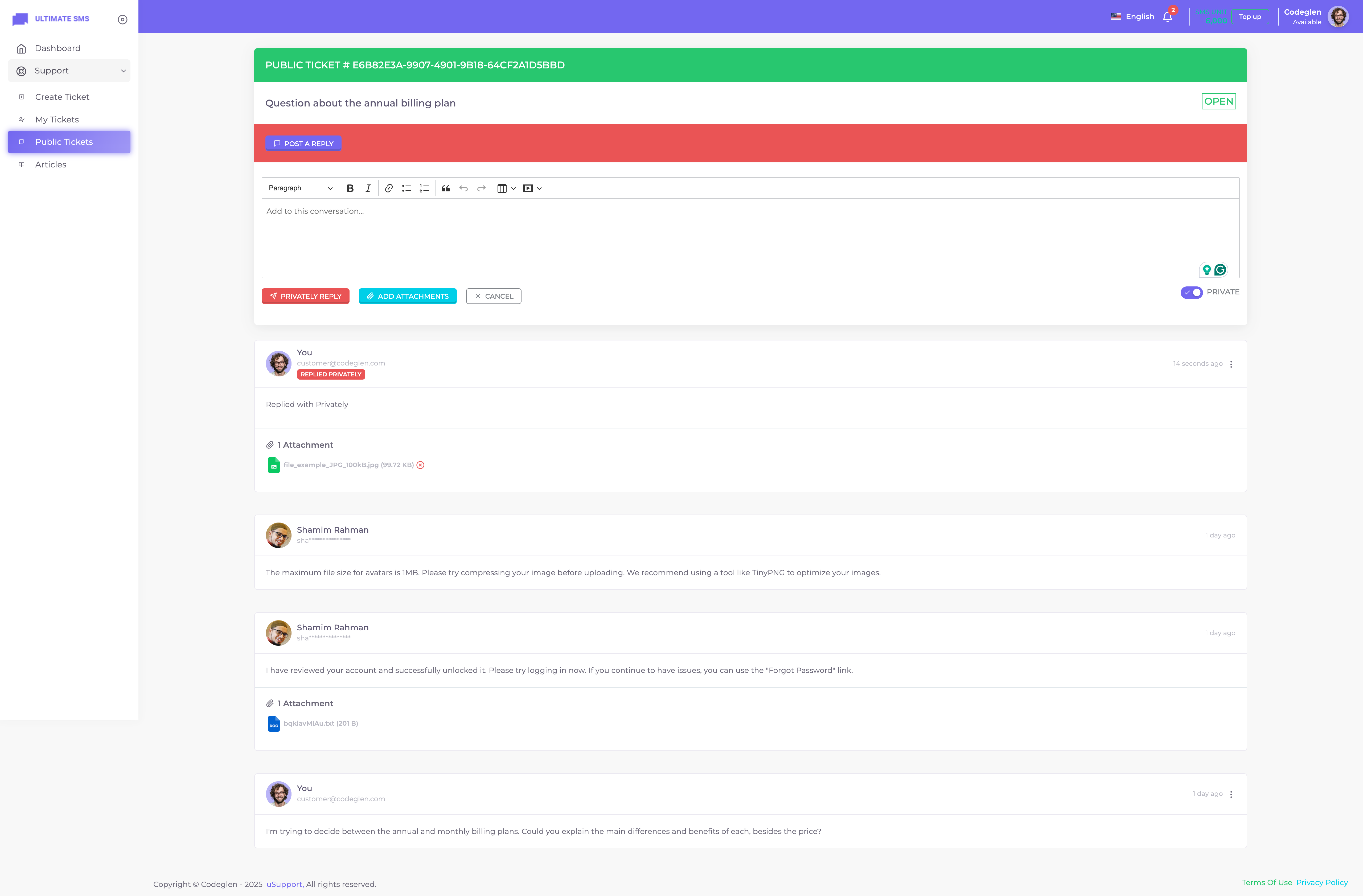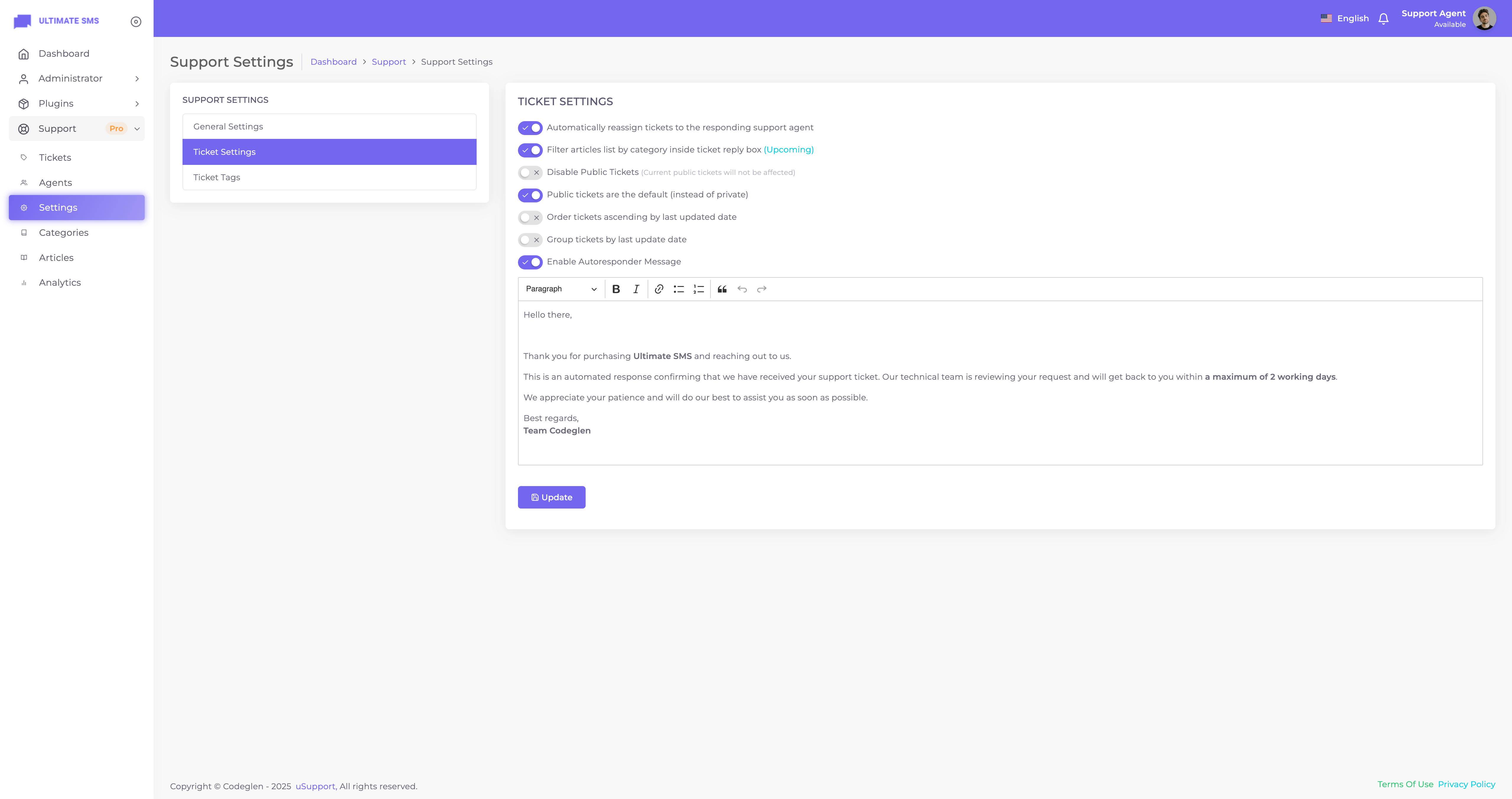 Thanks for getting in touch. Have you bought the uSupport – Support Ticket Plugin for Ultimate SMS? If yes, please create a support ticket on our support portal: Codeglen Support Forum. Our technical team will get in touch with you. Otherwise, you can put your pre-purchase questions in the public comments section