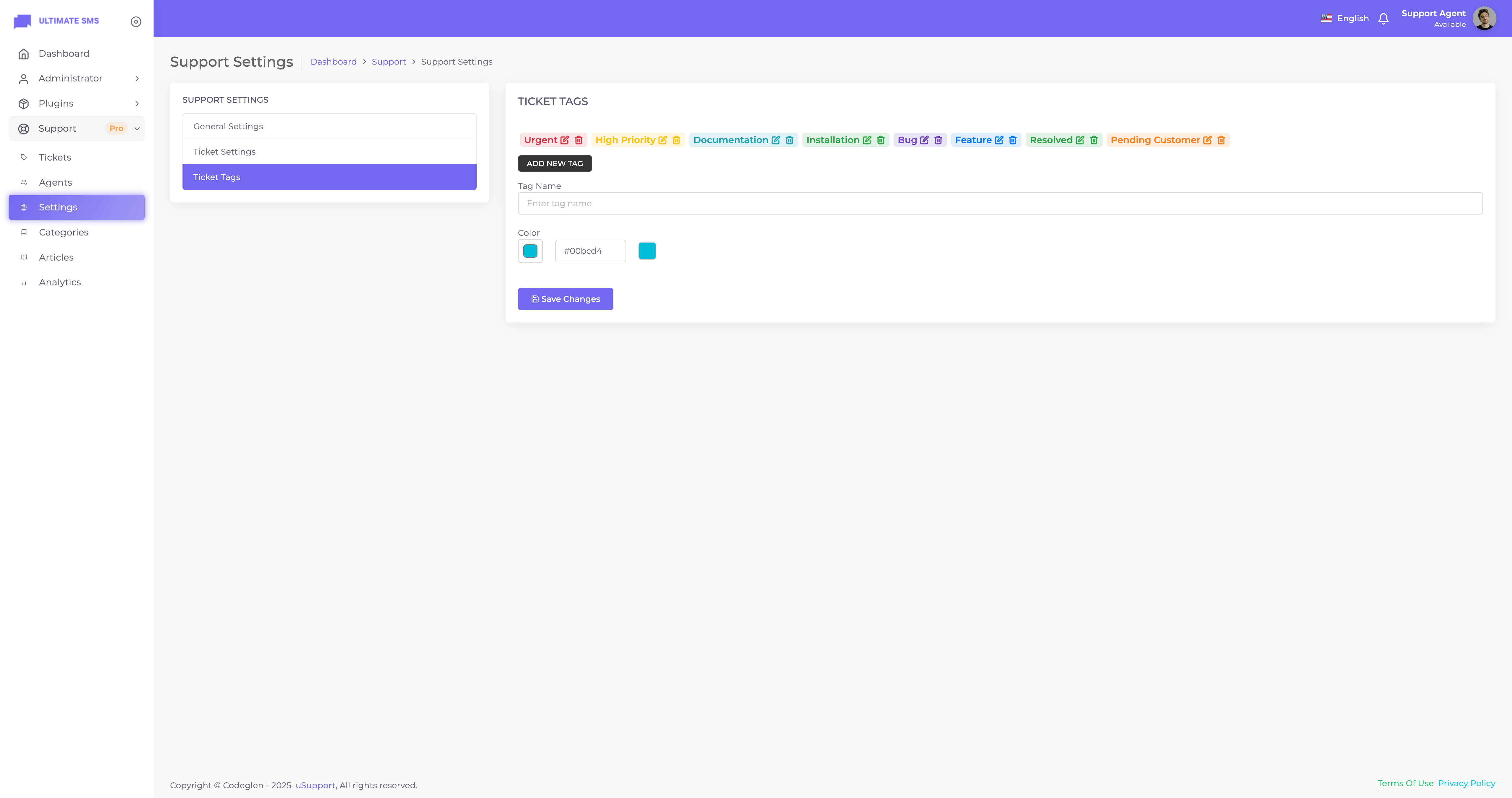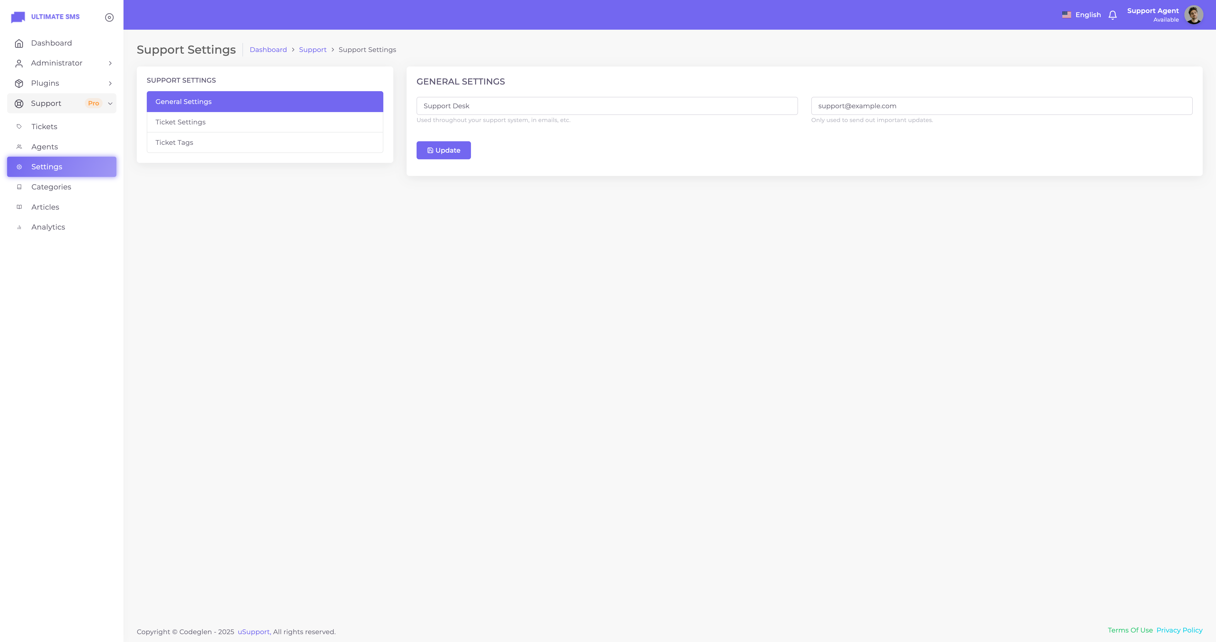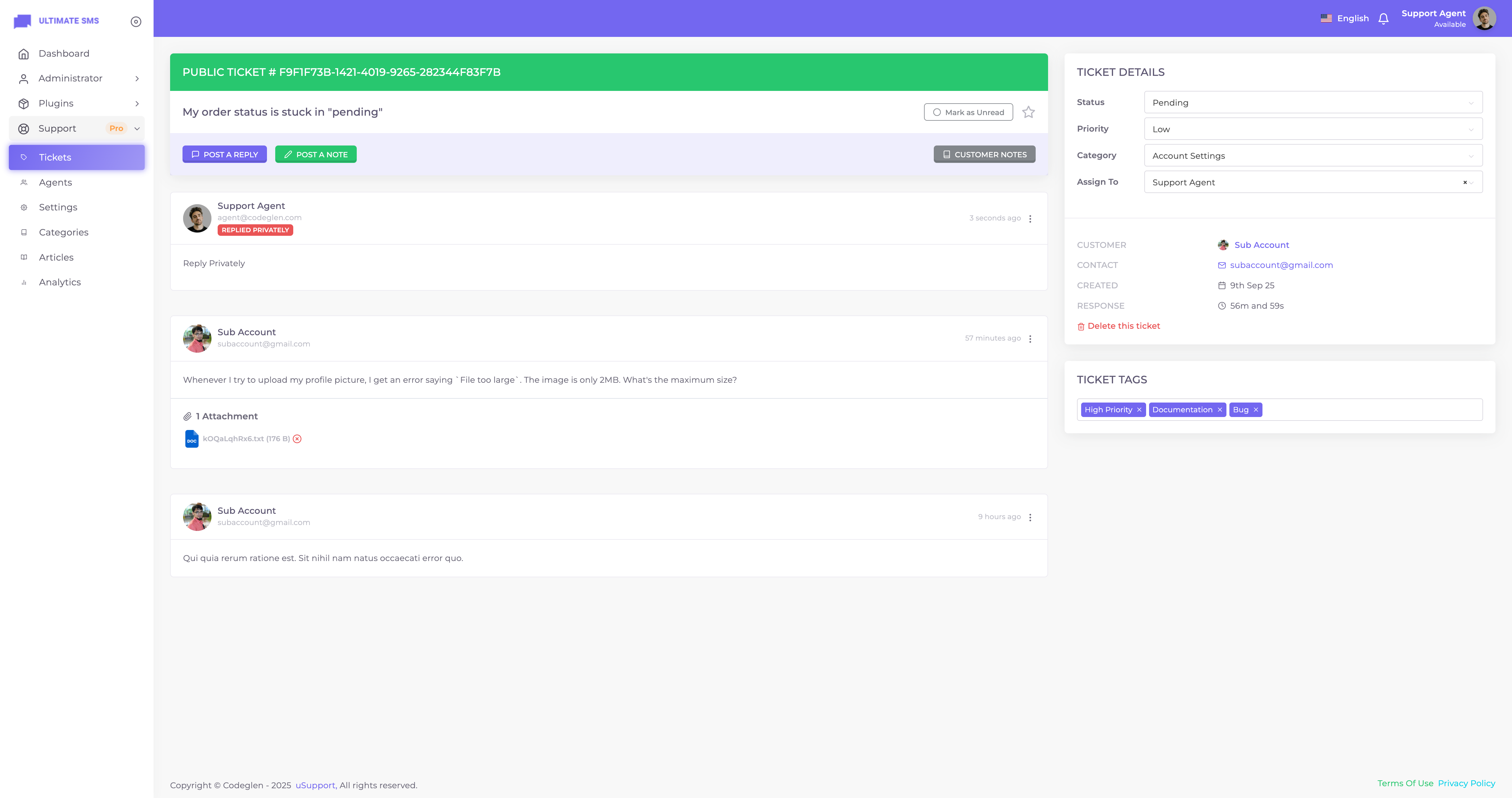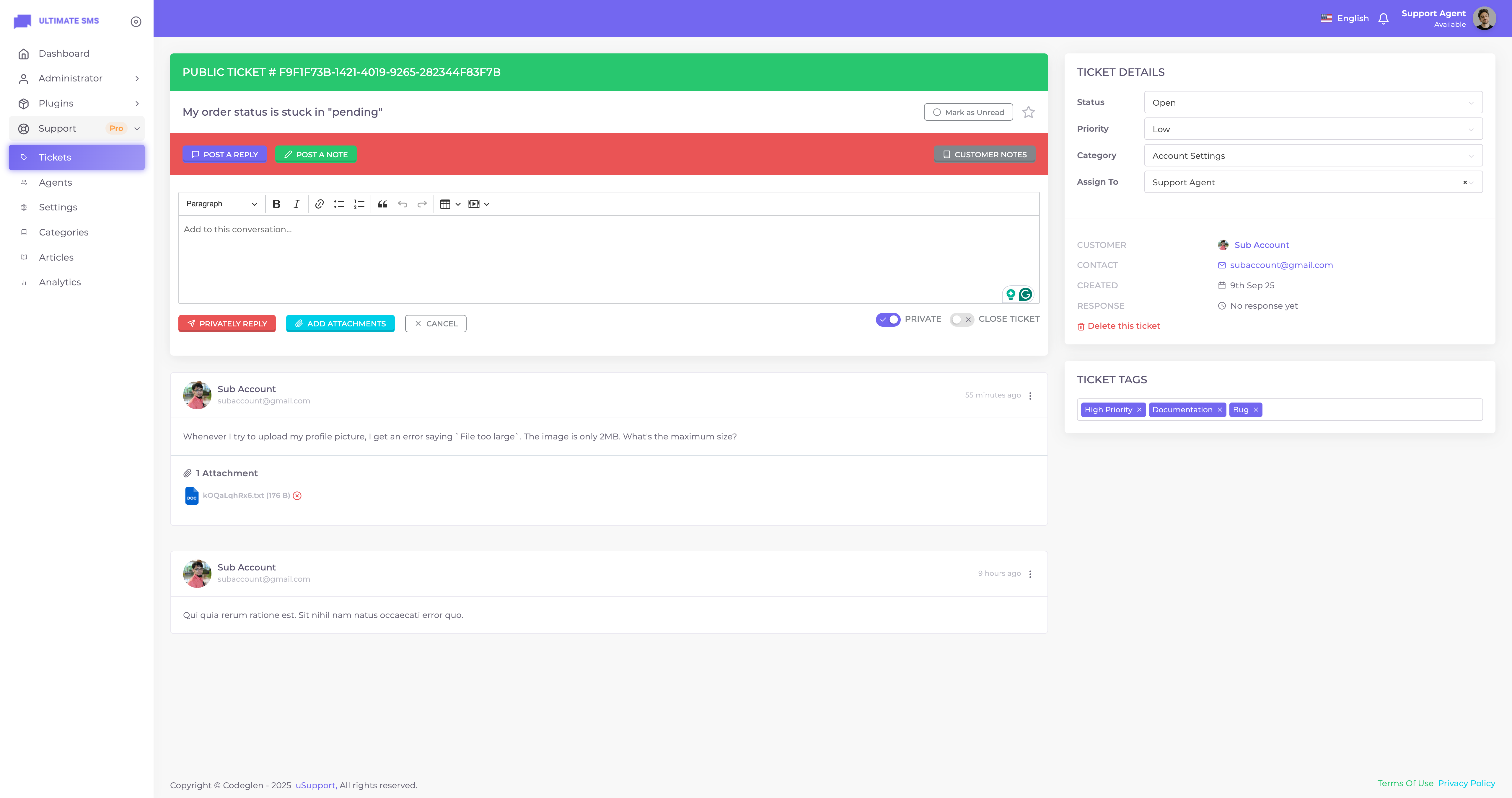 Thanks for getting in touch. Have you bought the uSupport – Support Ticket Plugin for Ultimate SMS? If yes, please create a support ticket on our support portal: Codeglen Support Forum. Our technical team will get in touch with you. Otherwise, you can put your pre-purchase questions in the public comments section