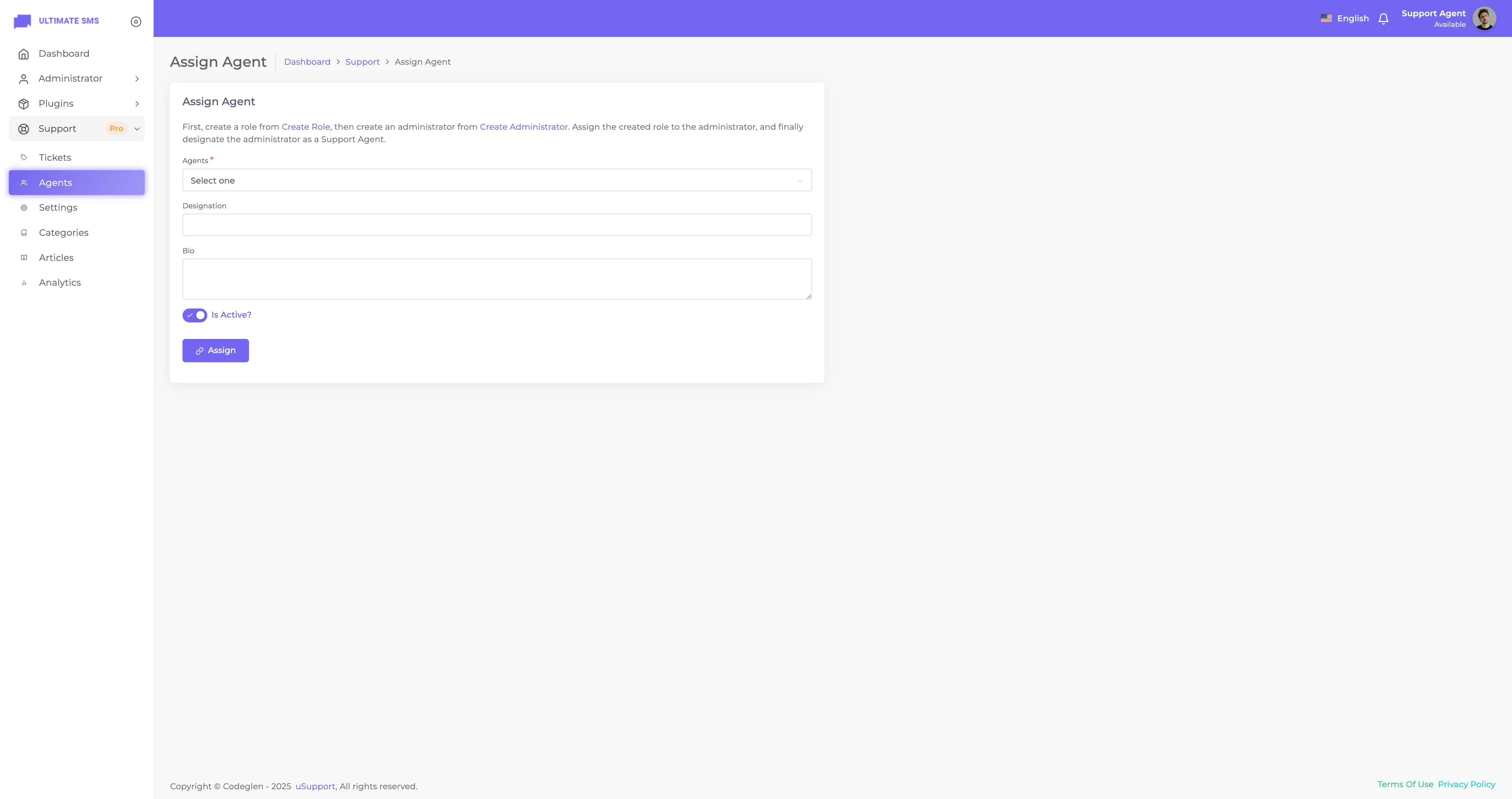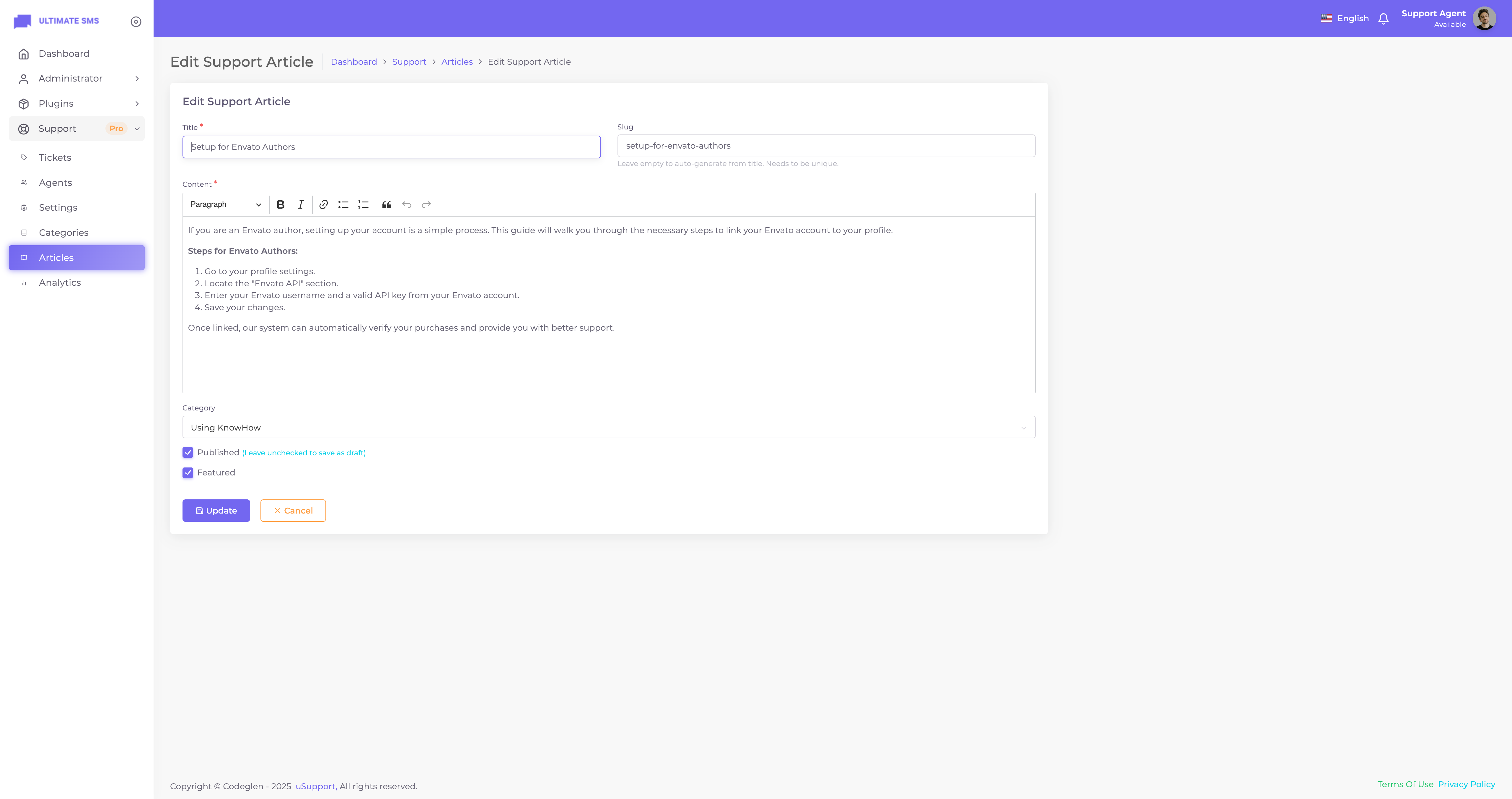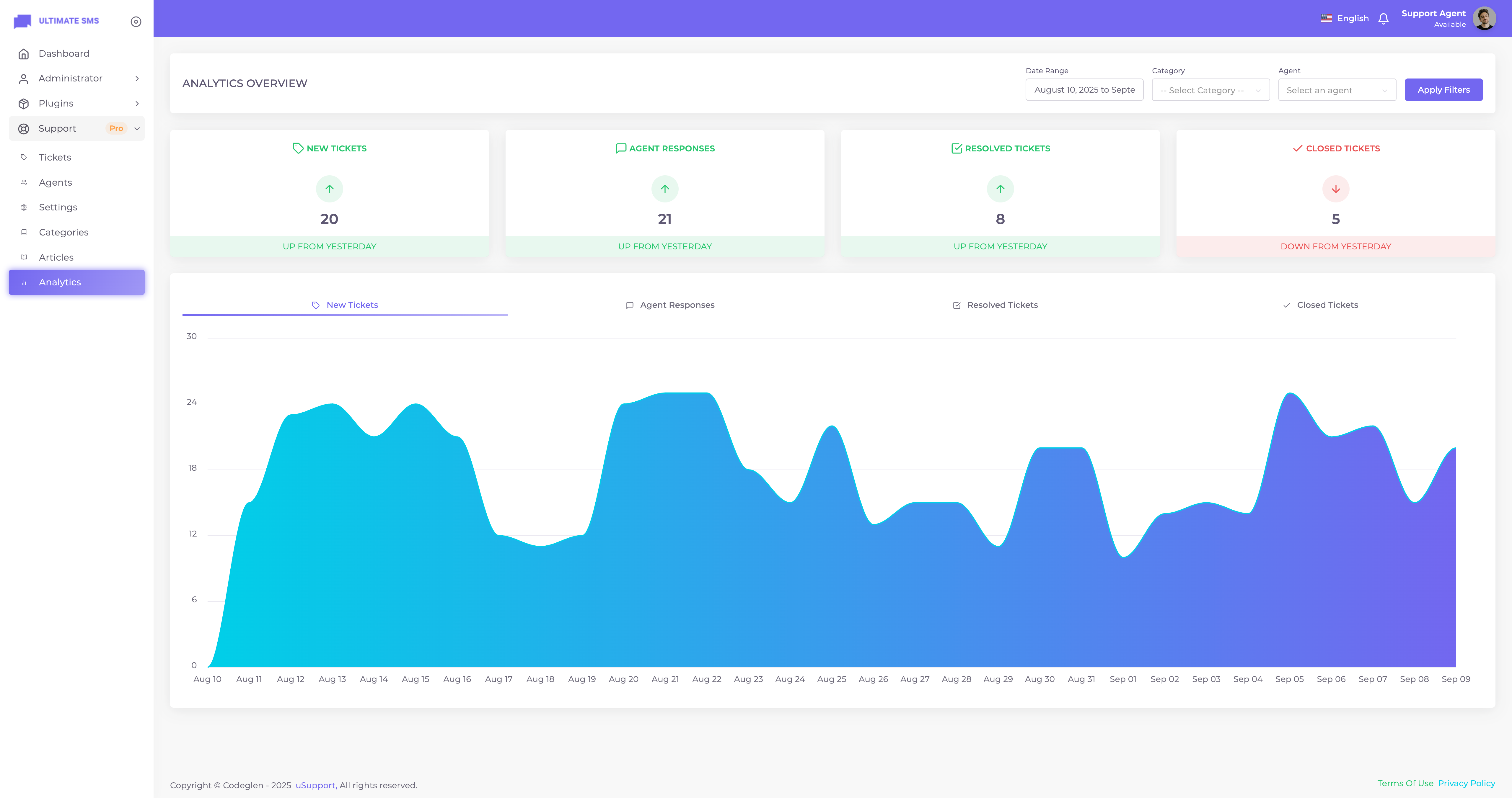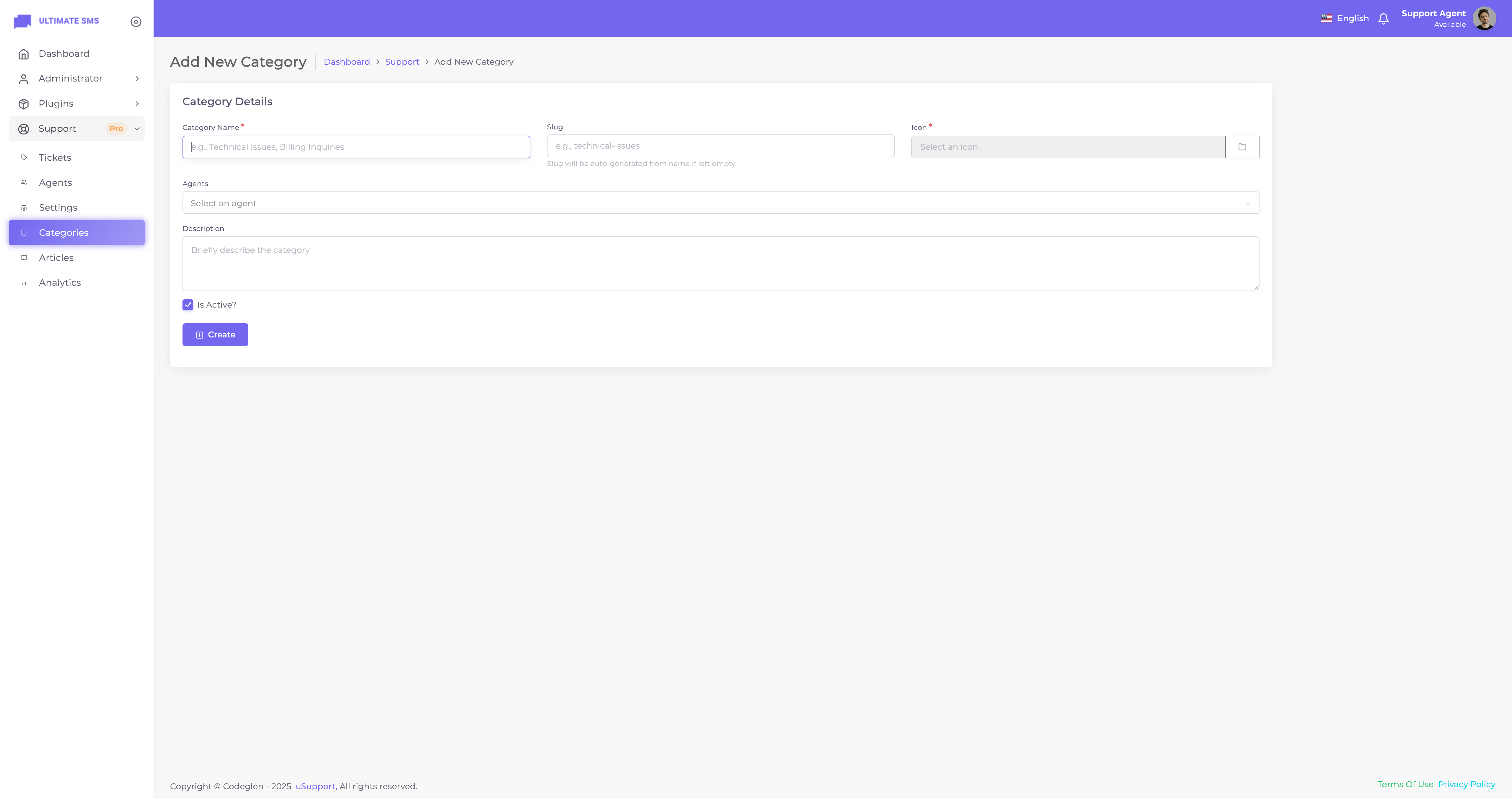 Thanks for getting in touch. Have you bought the uSupport – Support Ticket Plugin for Ultimate SMS? If yes, please create a support ticket on our support portal: Codeglen Support Forum. Our technical team will get in touch with you. Otherwise, you can put your pre-purchase questions in the public comments section