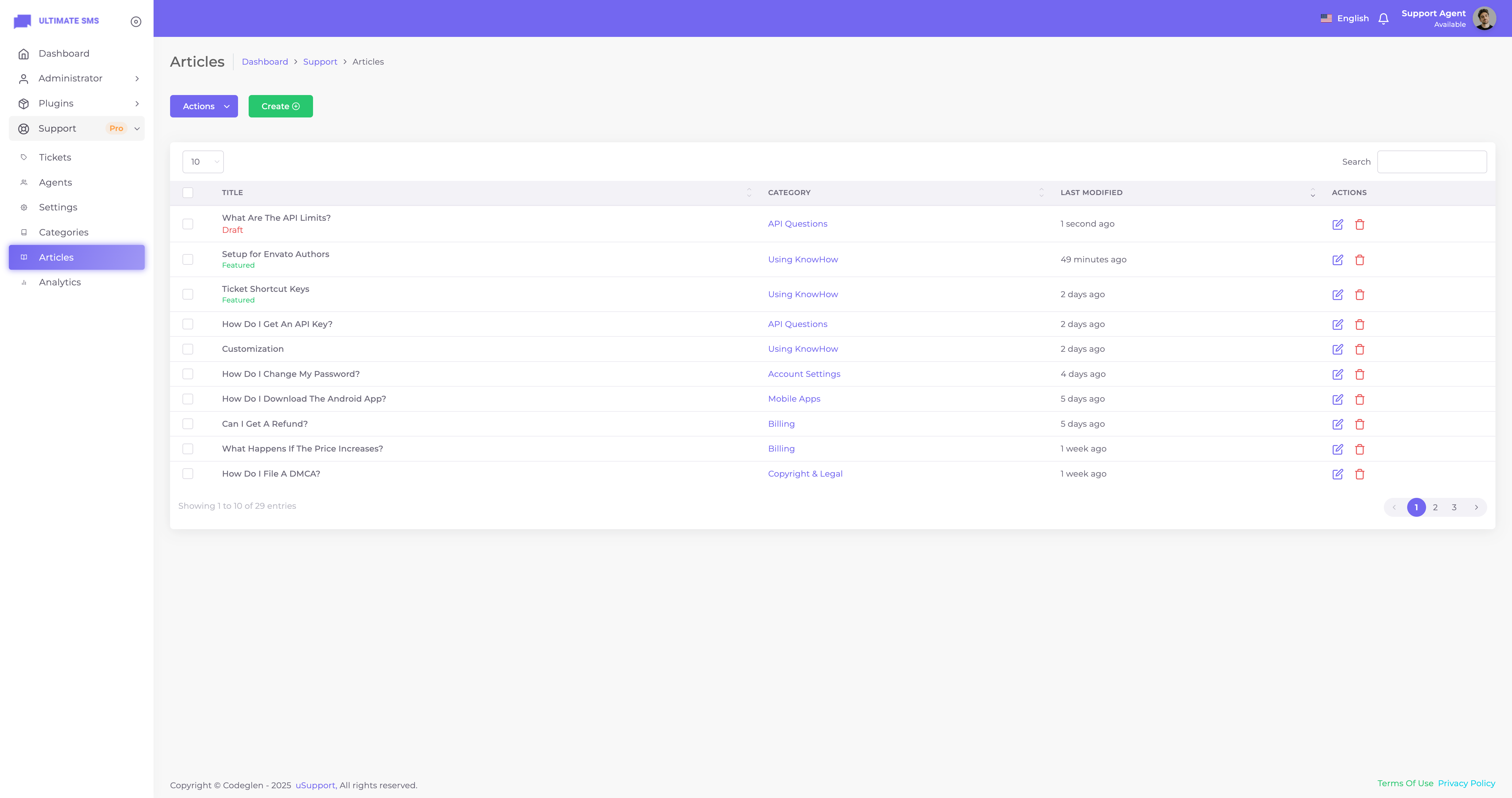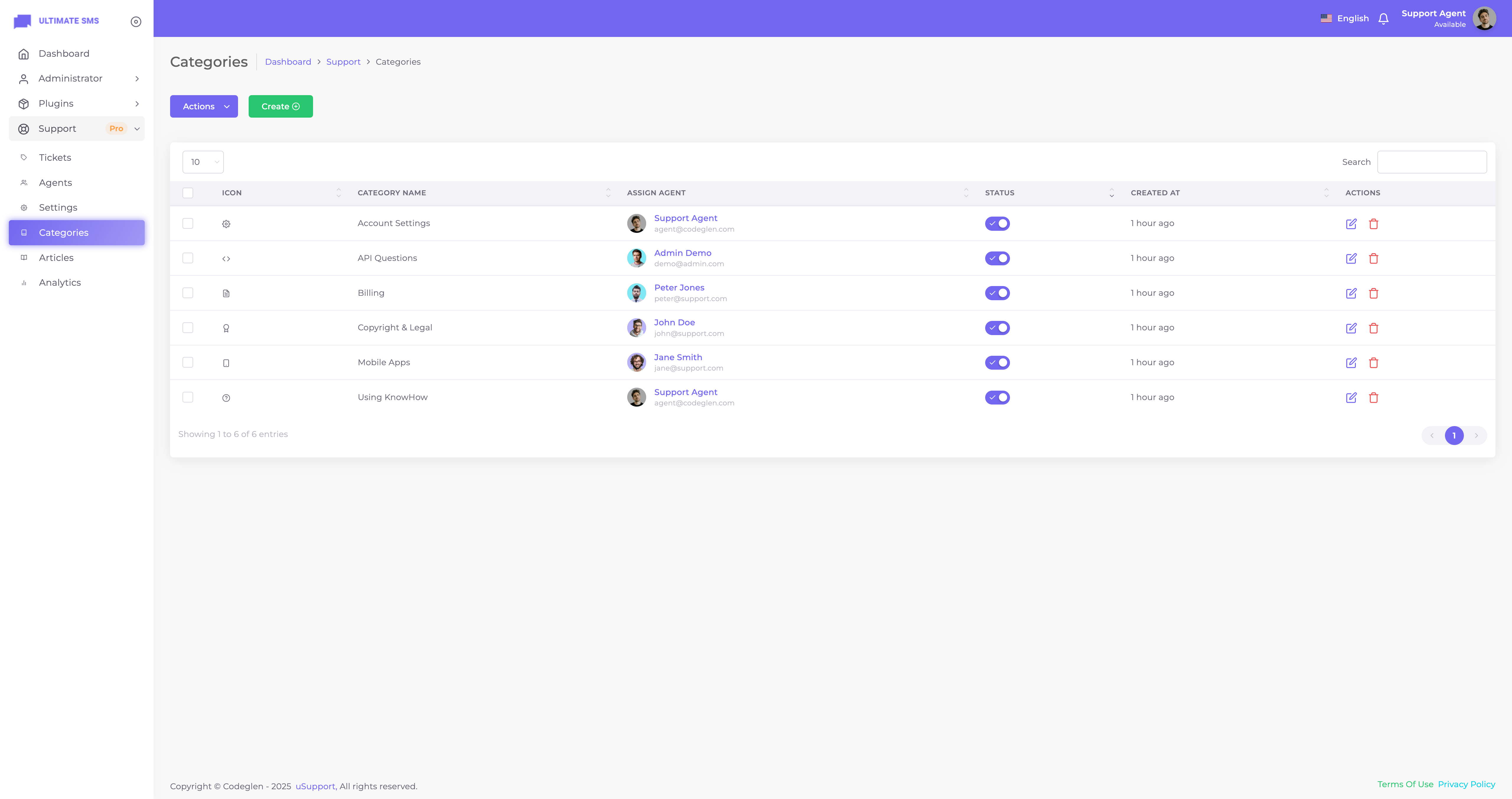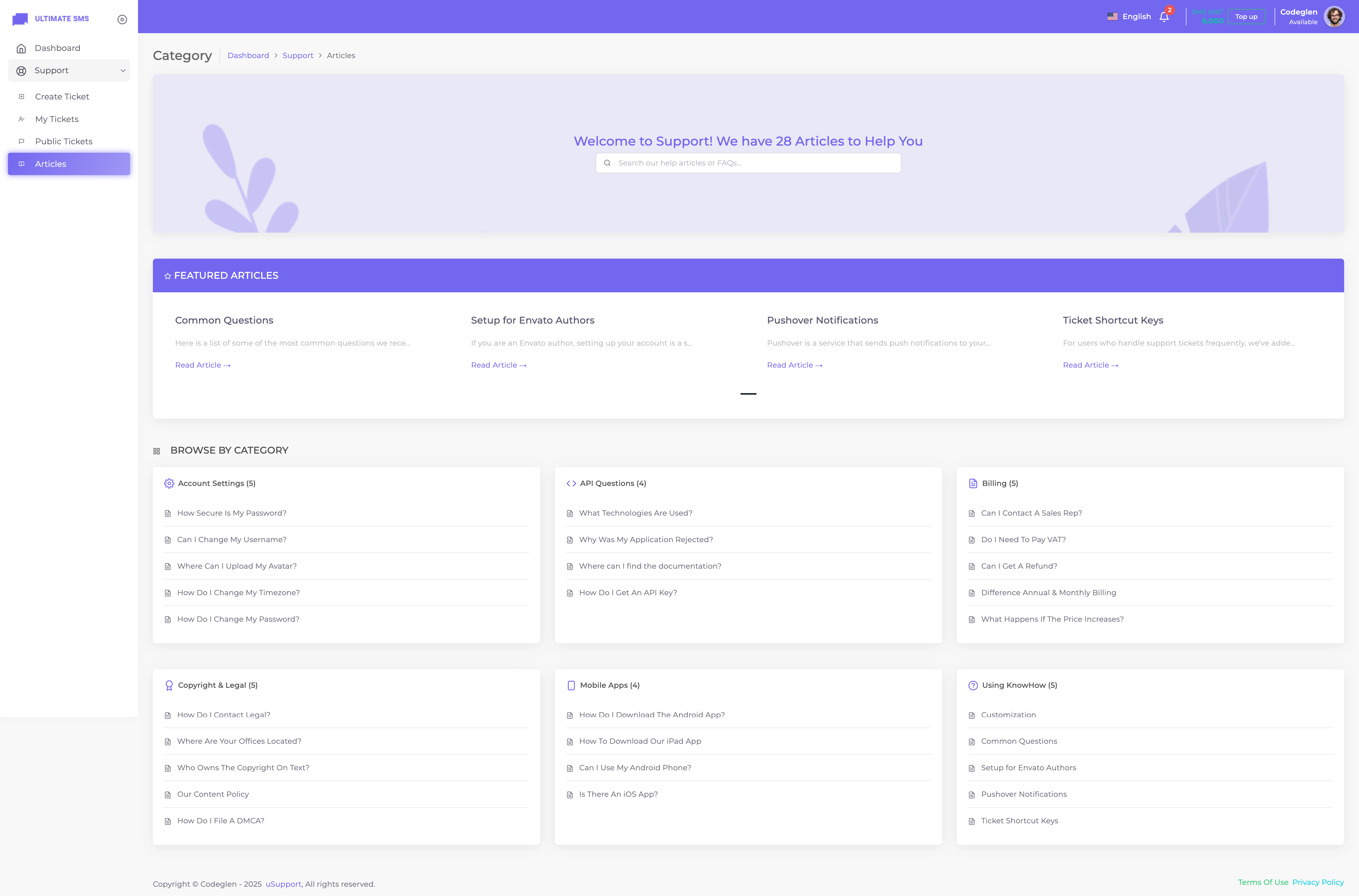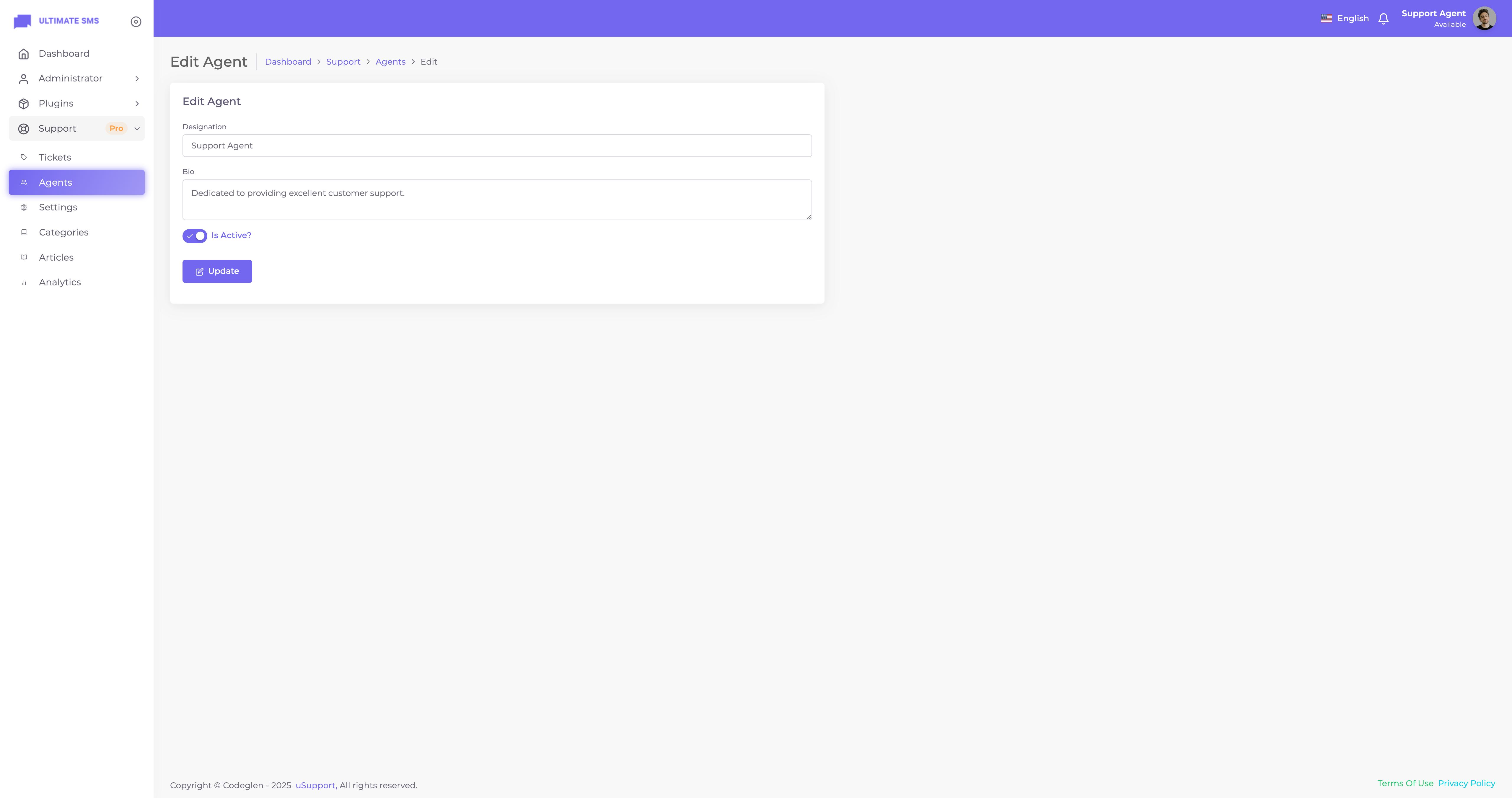Thanks for getting in touch. Have you bought the uSupport – Support Ticket Plugin for Ultimate SMS? If yes, please create a support ticket on our support portal: Codeglen Support Forum. Our technical team will get in touch with you. Otherwise, you can put your pre-purchase questions in the public comments section