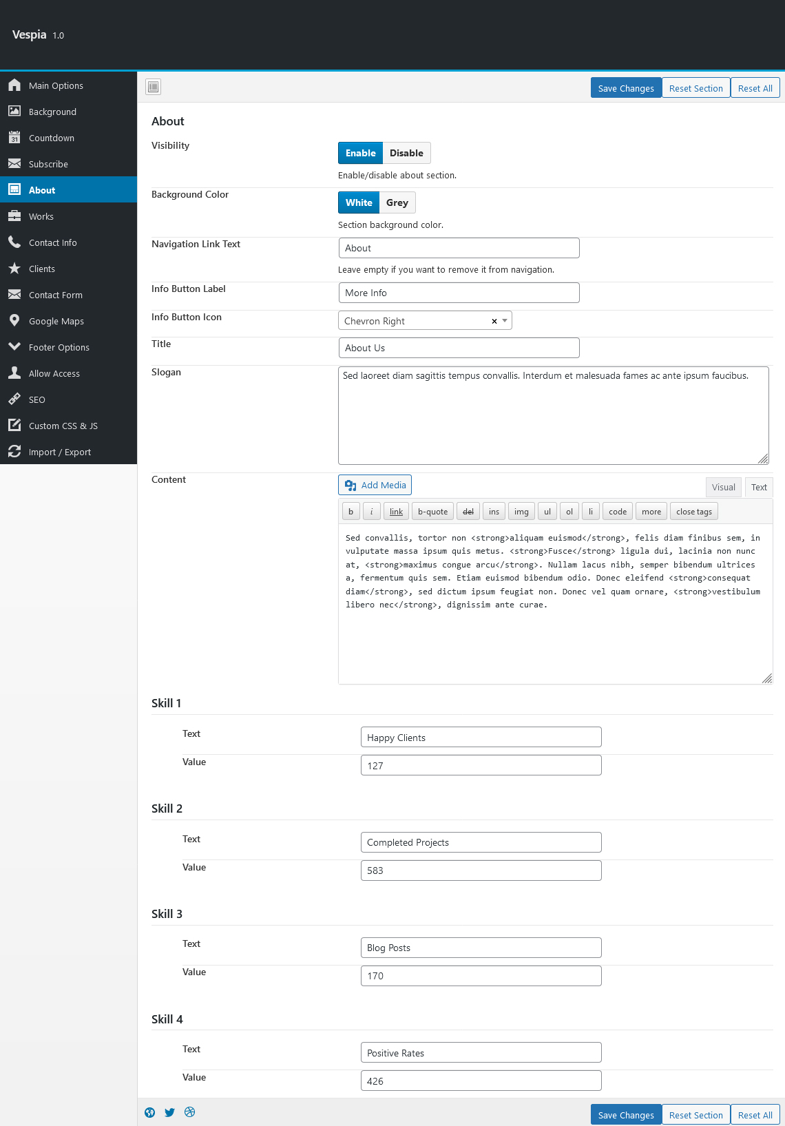 Vespia is a creative and professional coming soon WordPress Plugin built with Bootstrap framework. It includes Ajax MailChimp subscription, Contact Form and Google Maps.