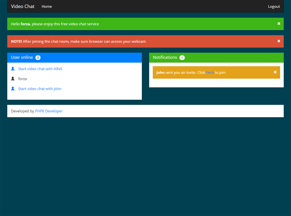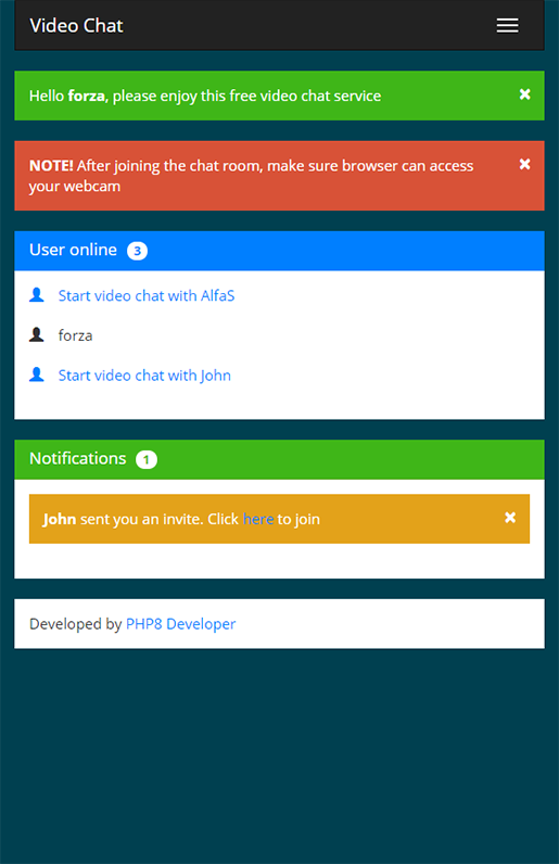 Video Chat is a web-based application for face-to-face video chat. The app is built using PHP, MySQL, and JavaScript. The script supports three independent video stream providers: VDO.Ninja, Jitsi, and GoMeet. All these providers utilize WebRTC for video/audio data flow.