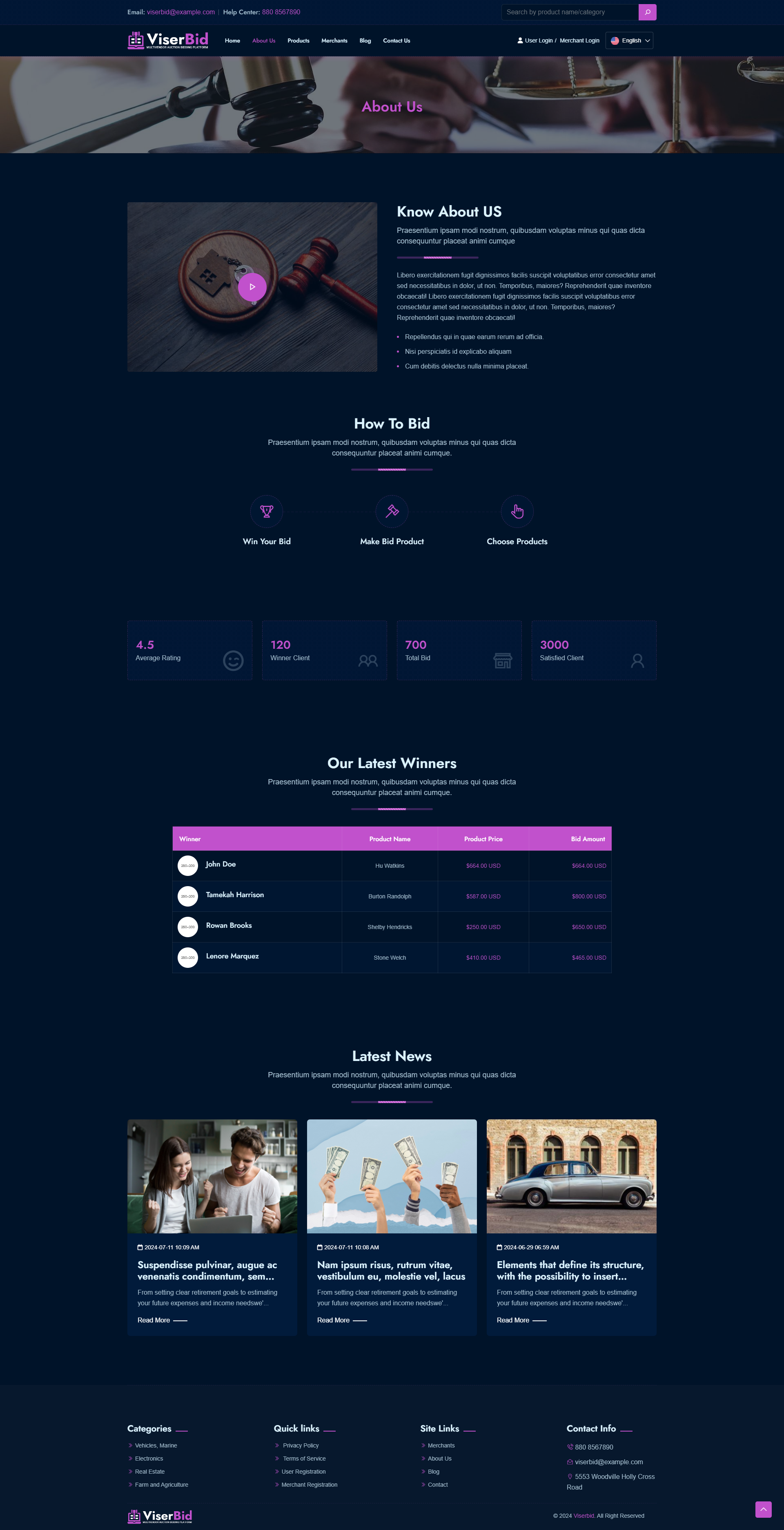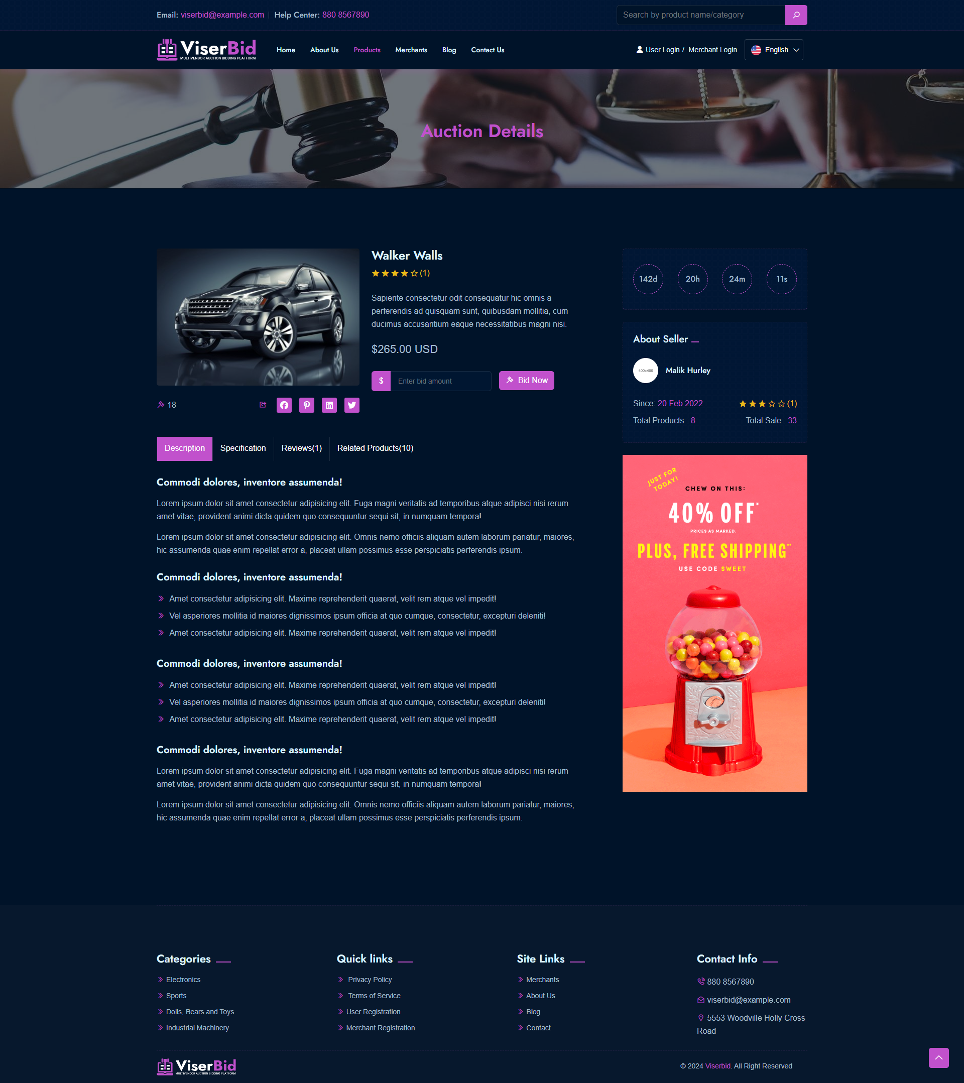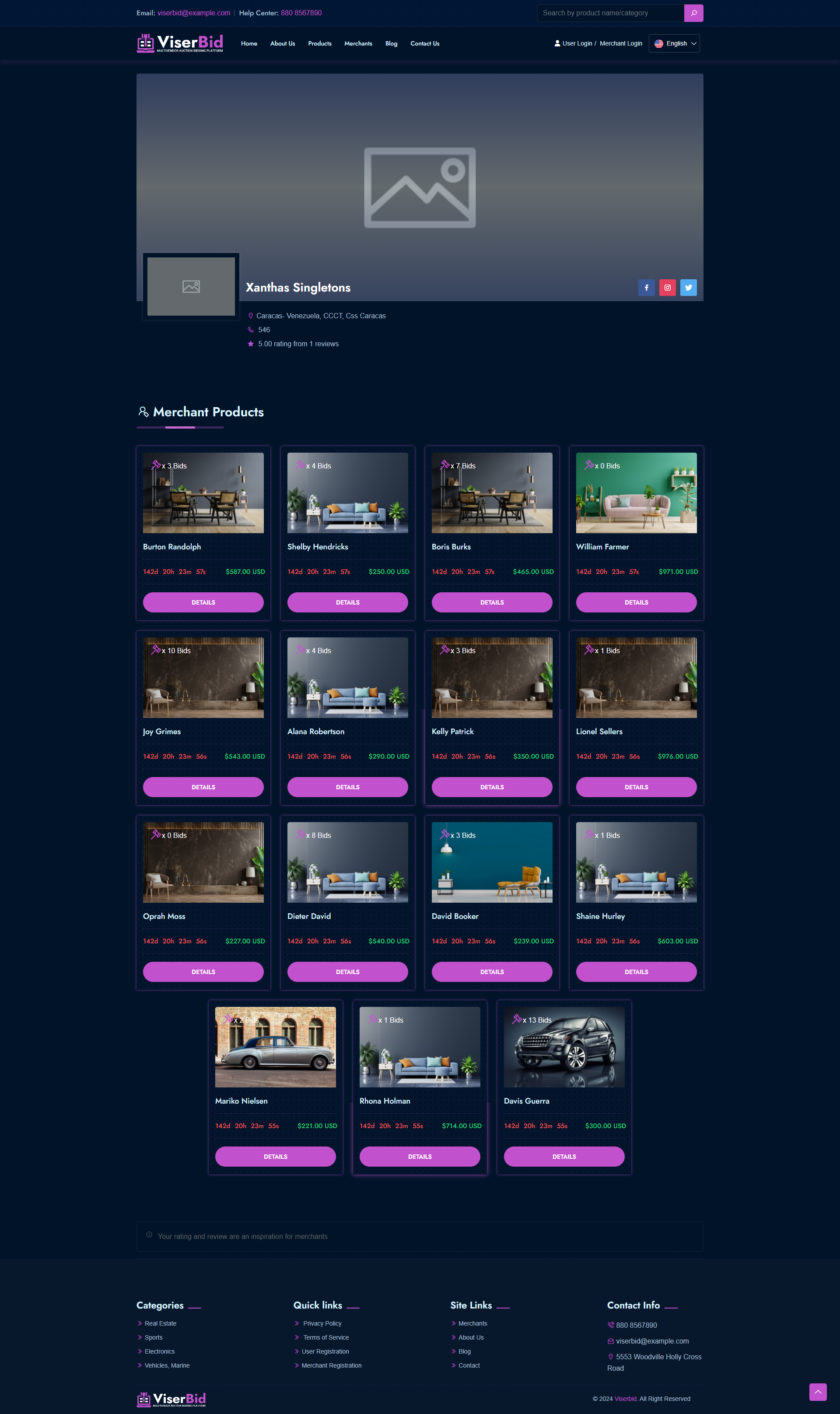 ViserBid is a complete solution for a Multivendor Bid and Win (Auction) website. ViserBid is an online-based platform that helps merchants and businesses from across the globe to sell their items by setting up an auction. A Marketplace auction platform is exactly what it sounds like: auctioneers list their catalogs in an online auction Marketplace right alongside their competitors. Common Marketplace auction platforms include Invaluable, the-Saleroom, EasyLive Auctions, and Live Auctioneers. operations here on ViserBid is very simple, the Merchants can set unlimited auctions from the Merchant panel, users are able to register for free and they are able to BID any item by any amount. when auction time will be finished, the top BIDDER will win the product or service. ViserBid is endlessly appealing, feature-loaded, customized, and possesses the remarkable capability of running on all devices and operating systems. This script comes with various automated online payment gateways to make the payment more easier and flexible.