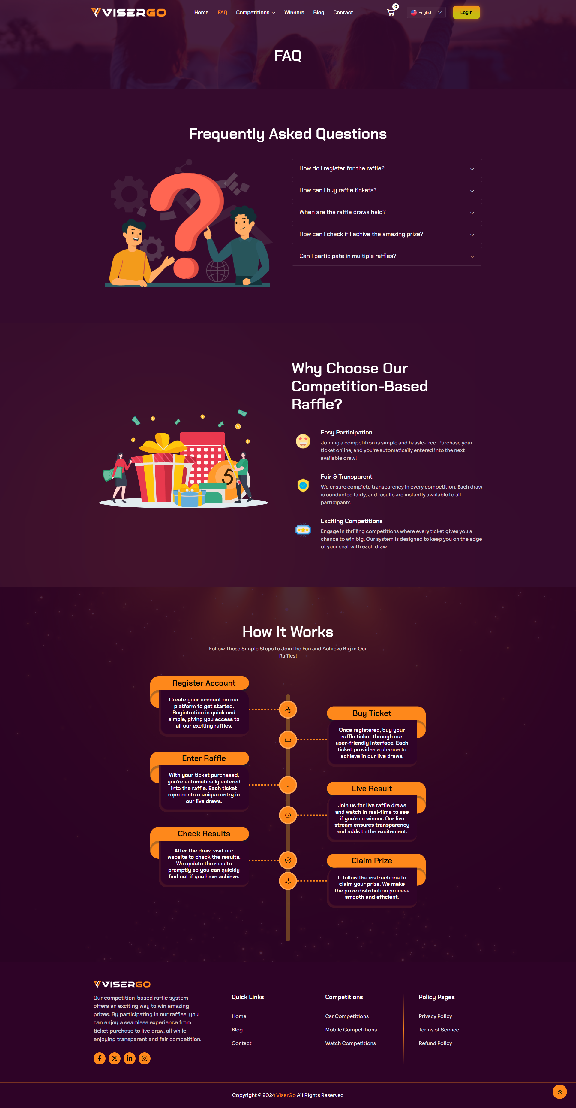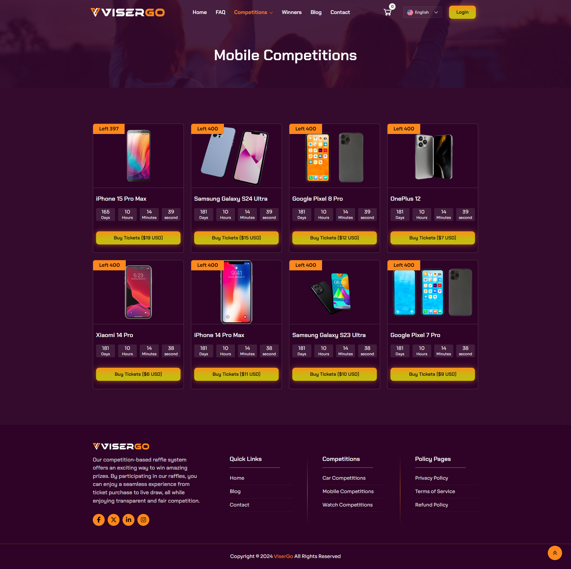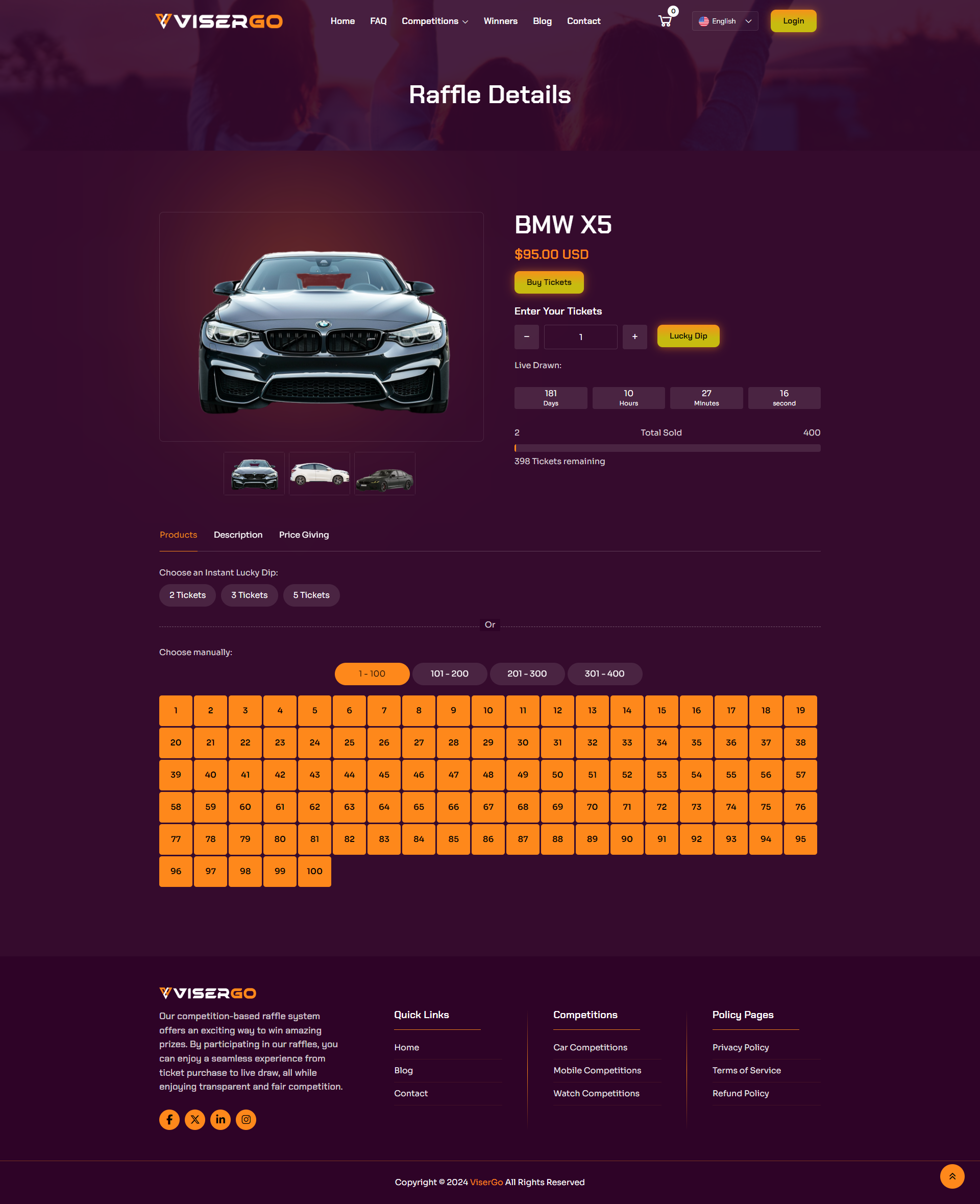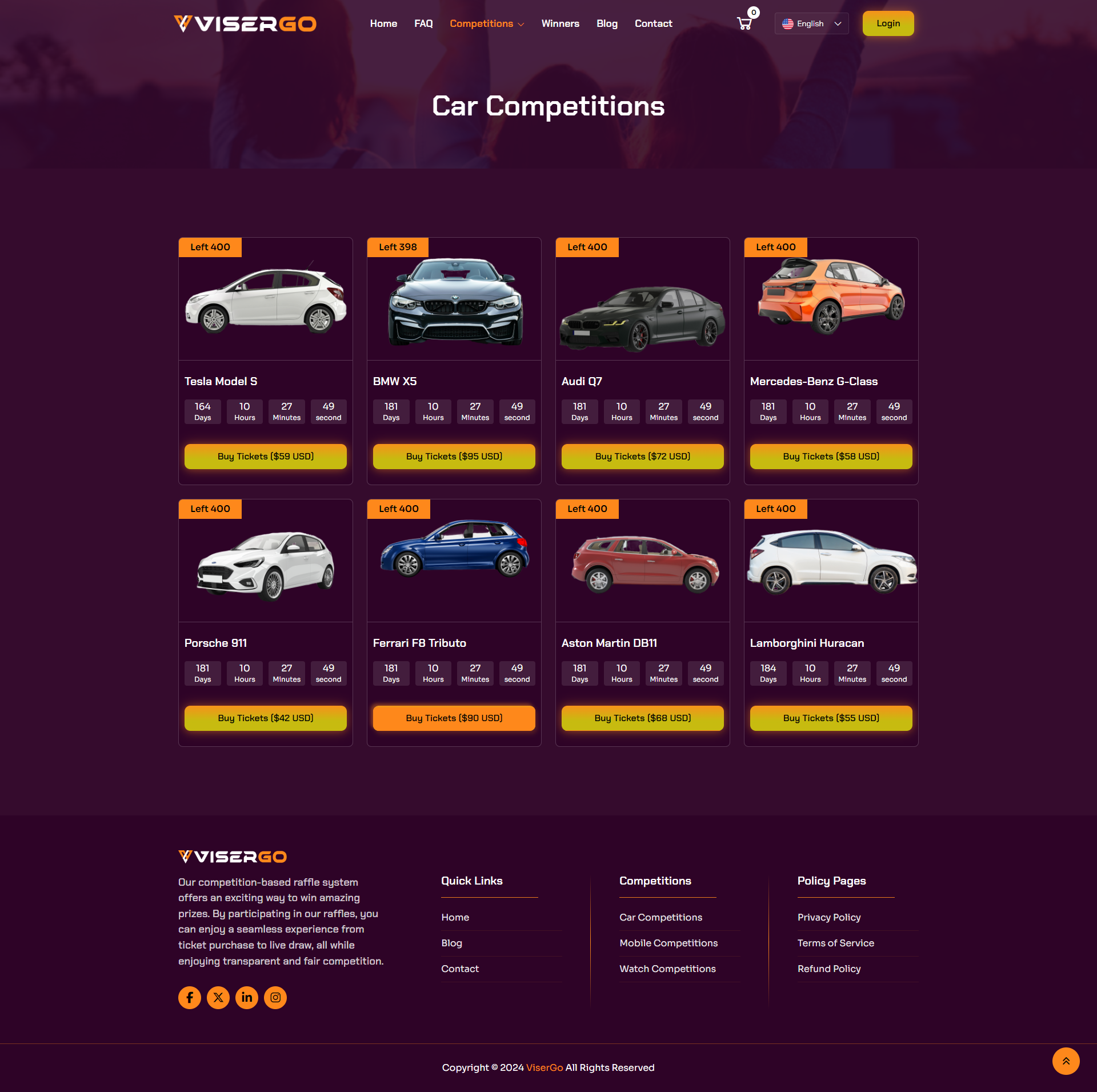 ViserGo Is an Online competition Platform, dive into the thrill of our competition-based raffle system, where your competitions could lead to exciting prizes! Purchase tickets for a chance to win a variety of amazing rewards. Our platform is perfect for those who enjoy the excitement of competition and the possibility of winning big. With multiple competitions and random draws, the opportunities are endless. Whether you’re aiming for cars, electronics, or more, our seamless experience ensures an engaging and rewarding journey from ticket purchase to prize draw.