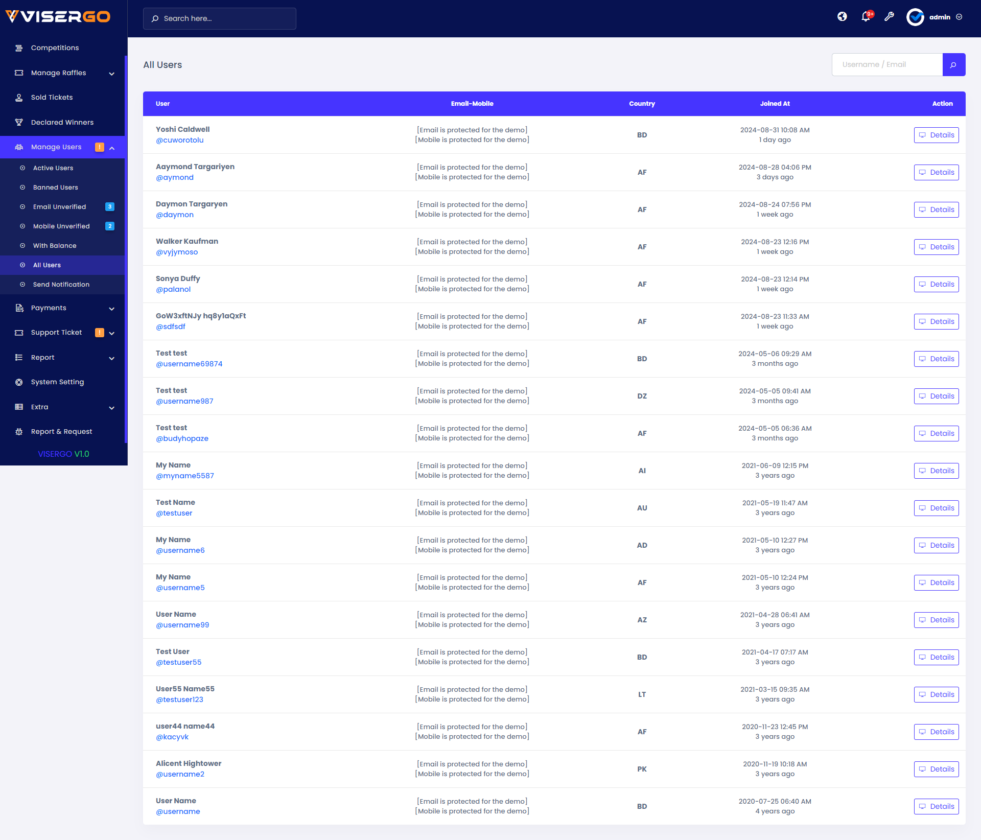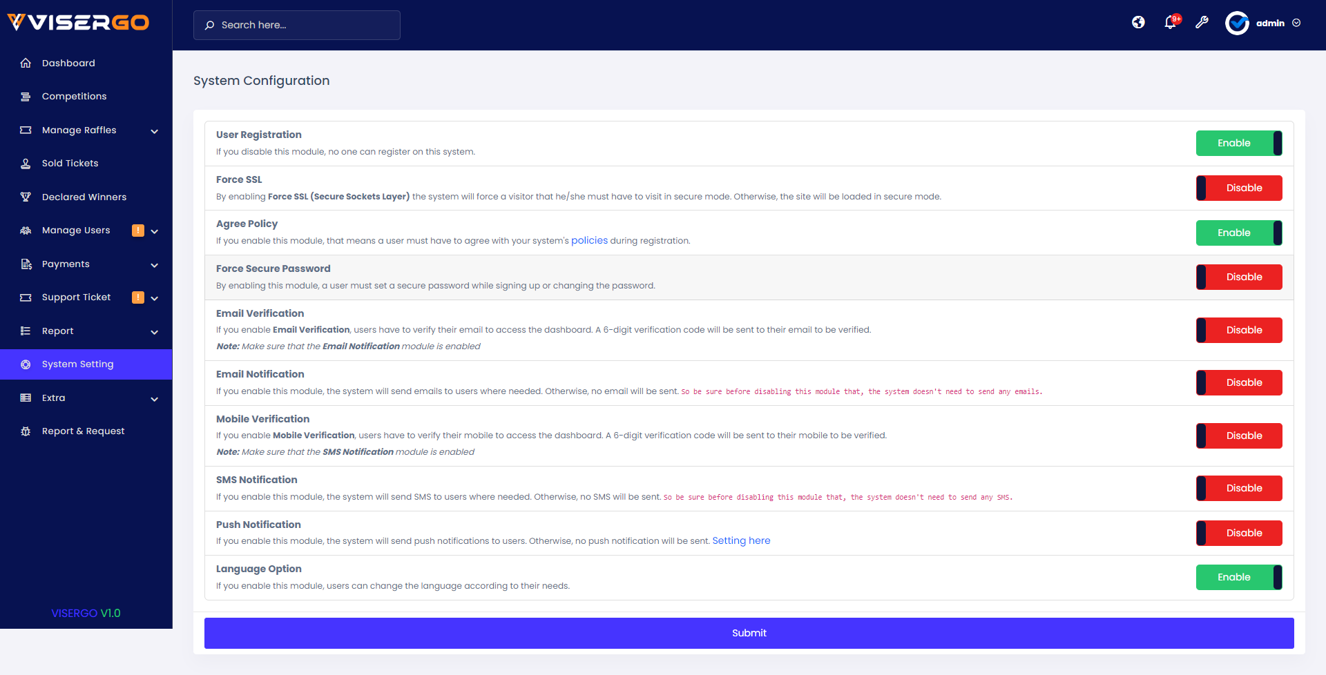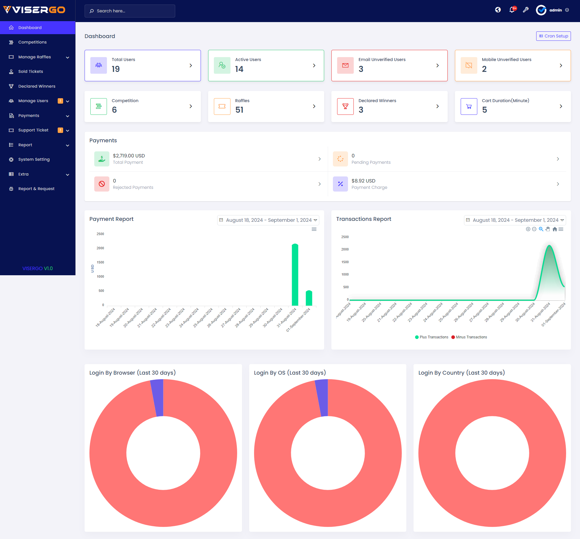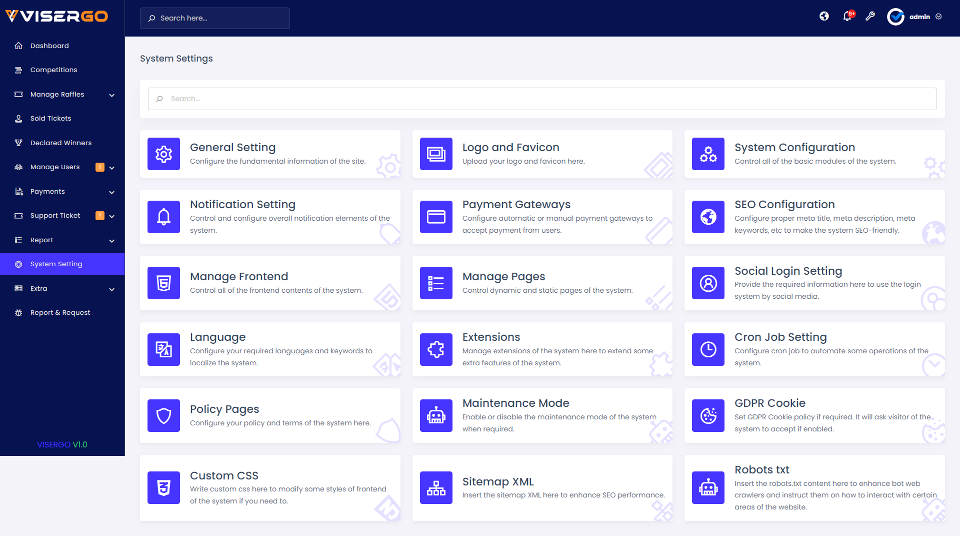 ViserGo can be accessed from a PC and a full-service mobile. It’s easily installable, and controllable through the admin panel, and comes with a responsive design, high security, interactive User interface. support plugins, LiveChat, Google ReCaptcha, analytics, automatic payment gateway, cards, currencies, and cryptos. we are also here to provide you with the best support, installation, and customization if you need it. Competition and raffles which are controllable from the admin panel, Premium images, HD animations, full source code, and full-service installation guidelines with documents