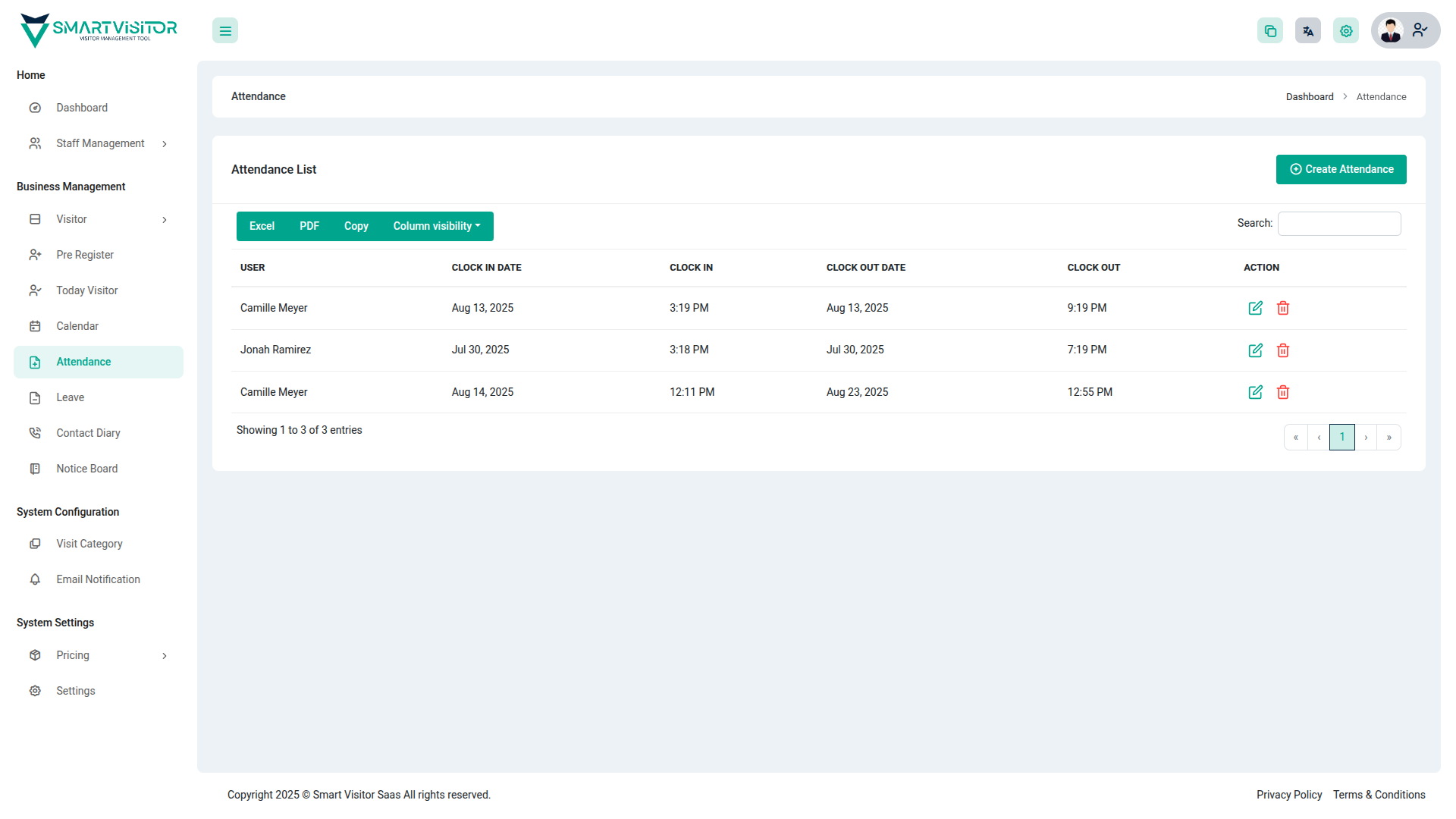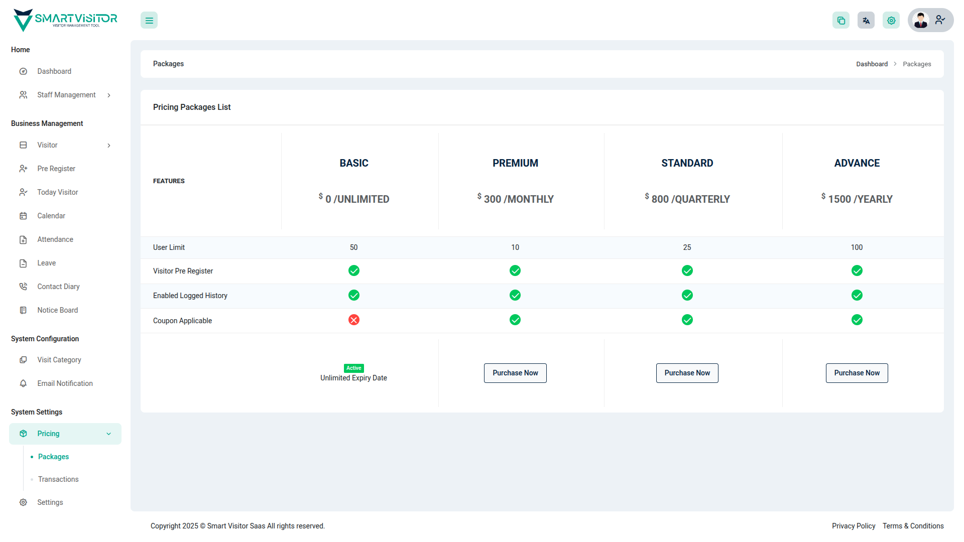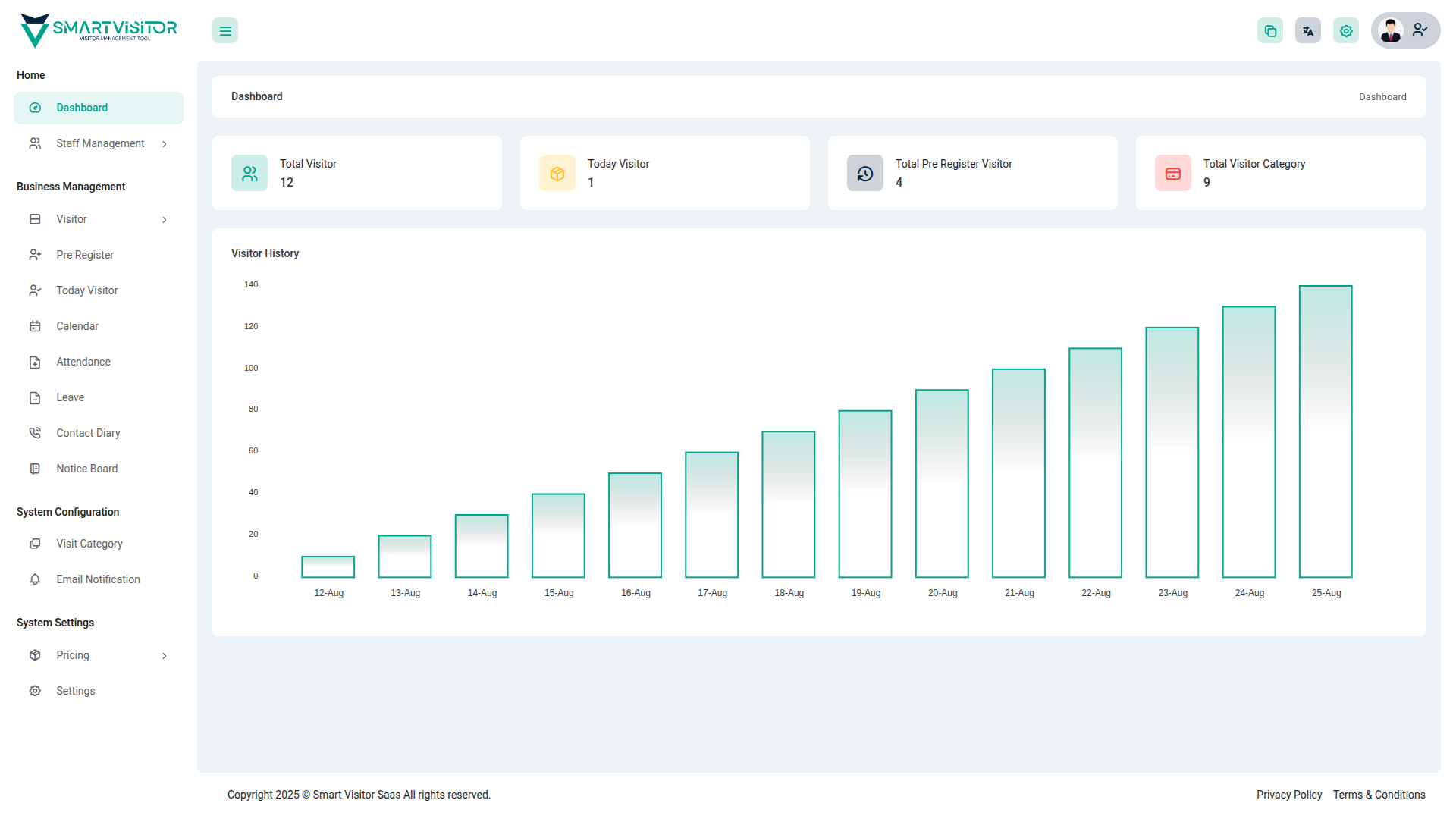 Version 1.7 (25 August 2025) * Added Attendance Module * Added Leave Module * Calendar View * SMS Notification Template * Twilio Integration for sending SMS * Visitor Card Features: Access via QR Code, Send to SMS, Unique URL, A4 Size Print, Thermal Print * Added Paystack Payment Integration