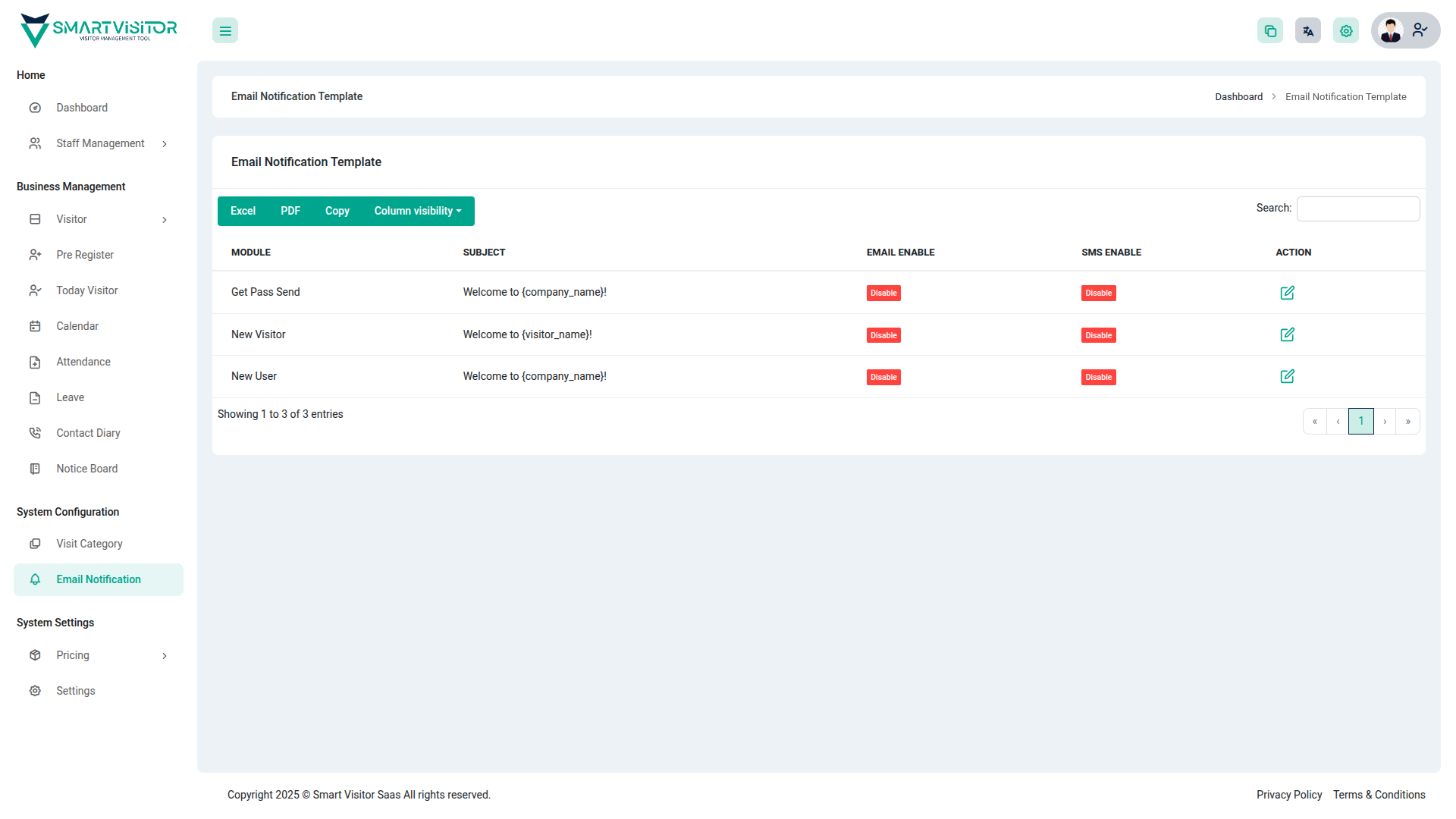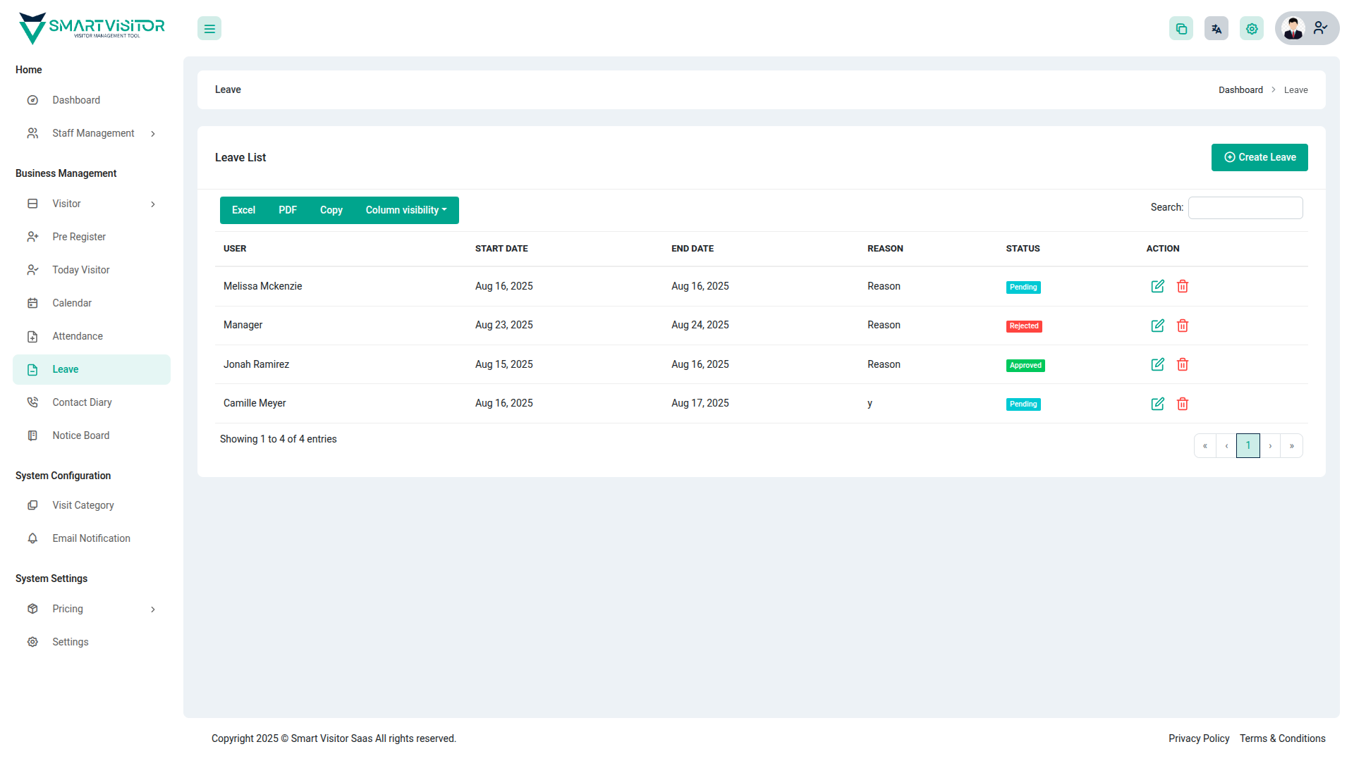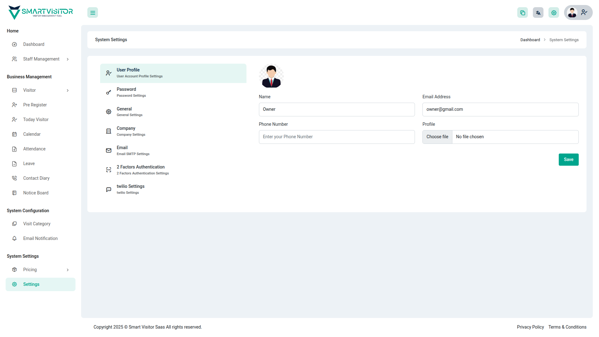Version 1.7 (25 August 2025) * Added Attendance Module * Added Leave Module * Calendar View * SMS Notification Template * Twilio Integration for sending SMS * Visitor Card Features: Access via QR Code, Send to SMS, Unique URL, A4 Size Print, Thermal Print * Added Paystack Payment Integration