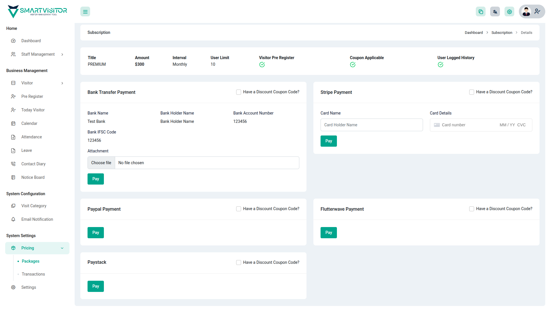 - Bank Transfer, PayPal, Strip, Flutterwave & Paystack Payment Integration