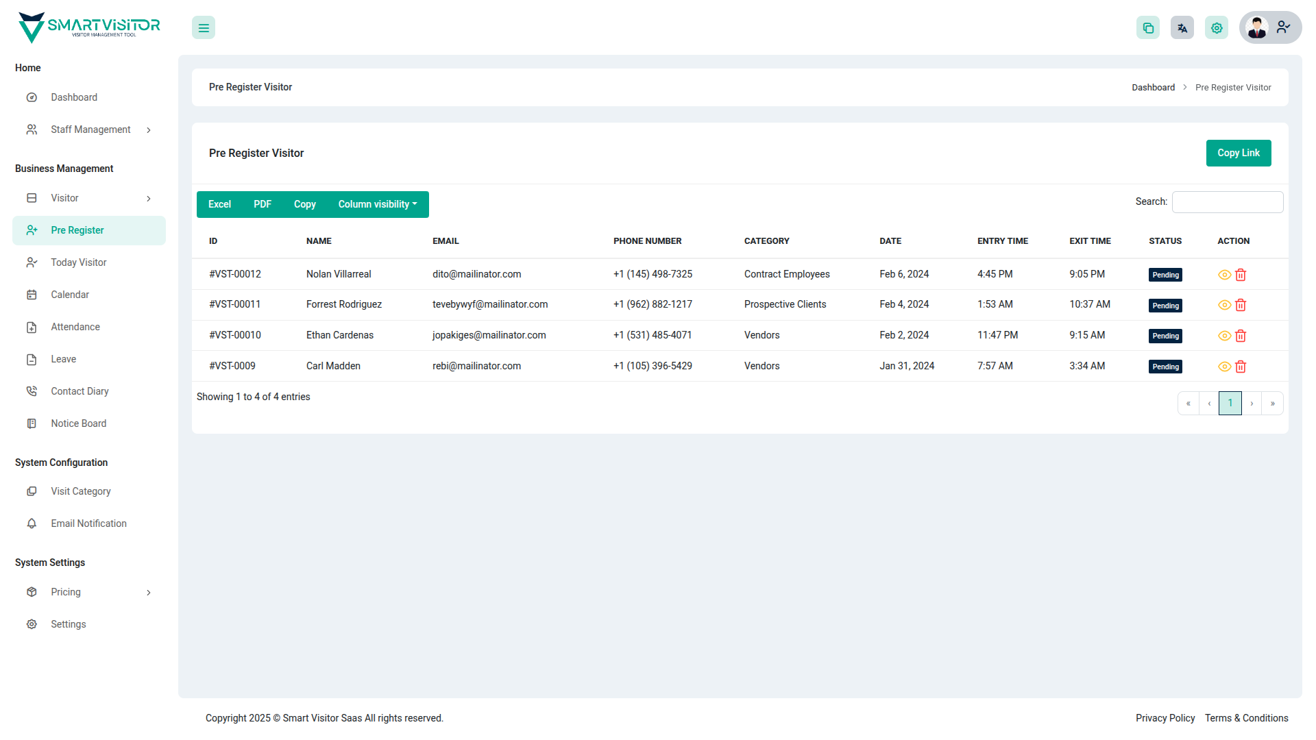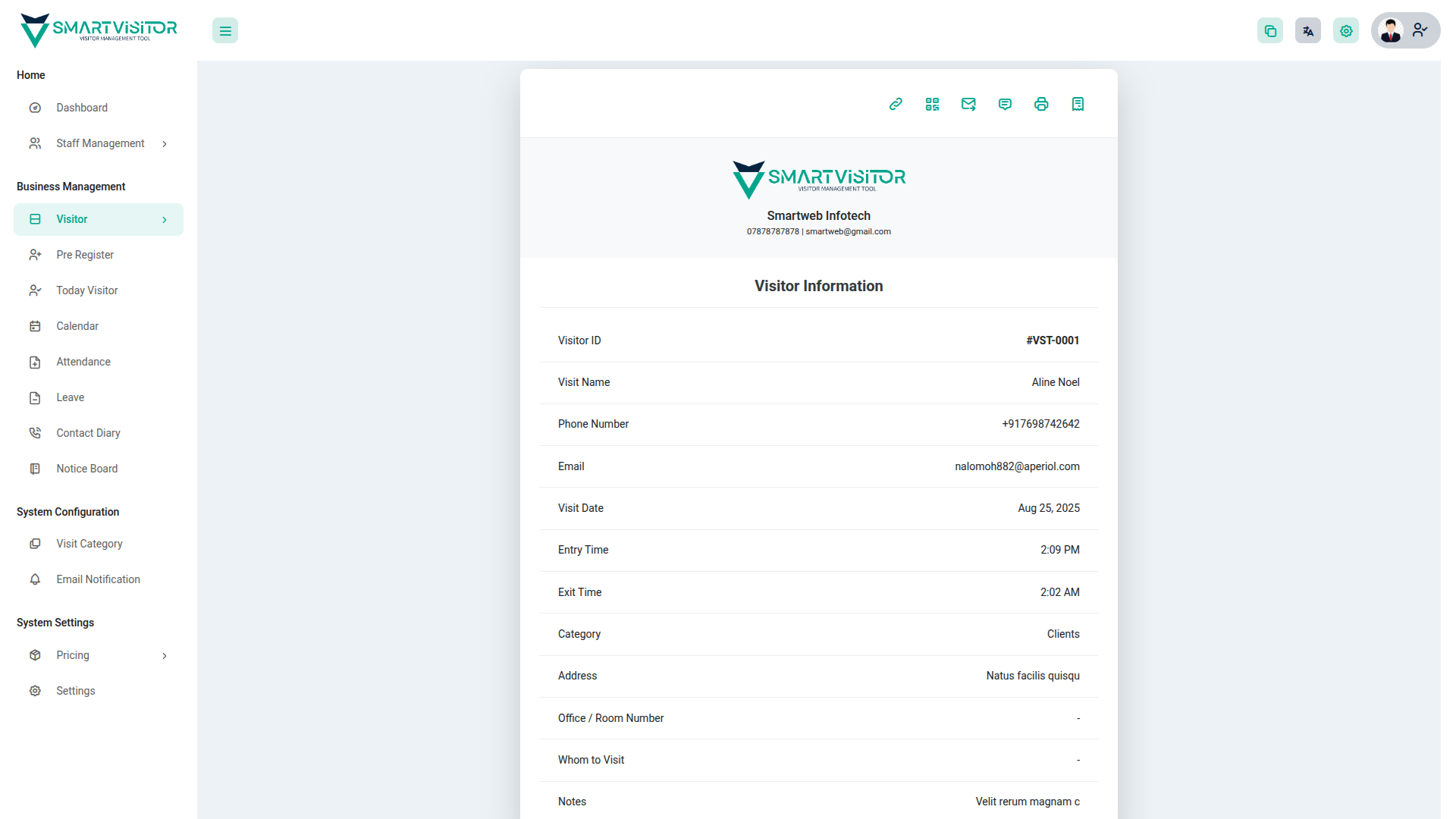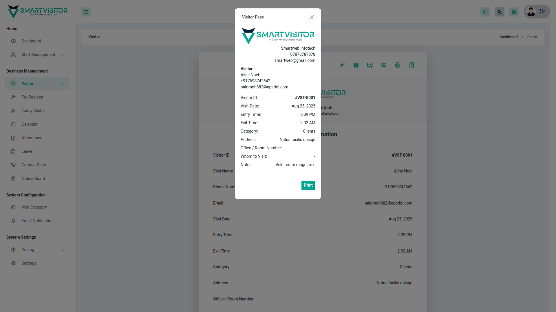 - Visitor Card Features : Access via QR Code, Send to SMS, Unique URL, A4 Size Print, Thermal Proint