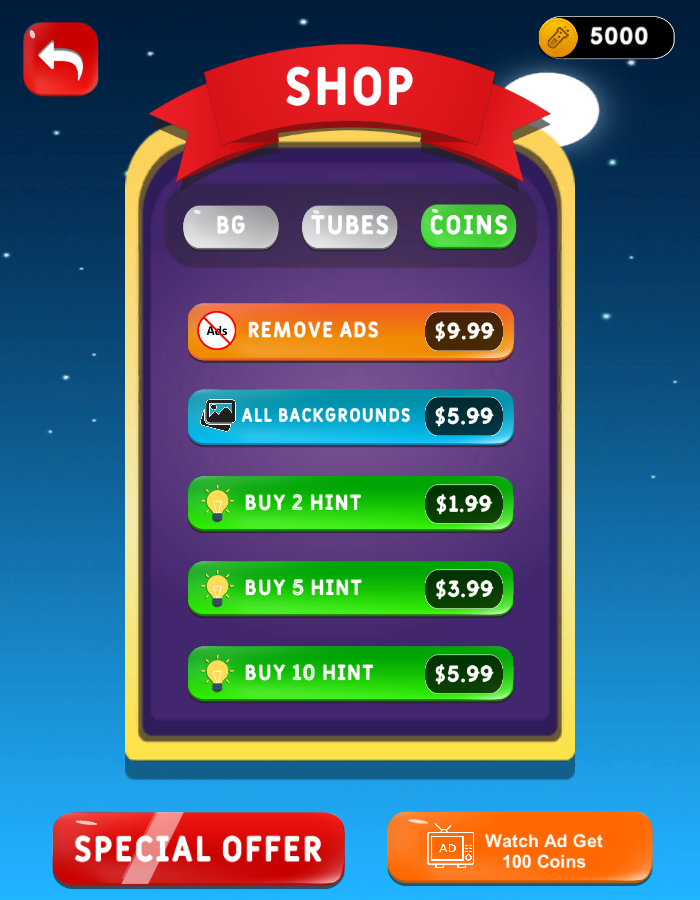 Features: · Attractive UI Design · Easy one-finger control · Realistic physics and animations · Beautiful theme and Glass tubes/bottles · 100 Exciting levels Included · Hints Options · Add Extra Cube Options · High-quality graphics and exciting sort puzzle sounds · A great game to kill time and train your brain · Shop Including Bottles, Backgrounds, And Coins · In-app Purchases with Multiple Special offers · Ads (Banner, Interstitial, Rewarded Ad)