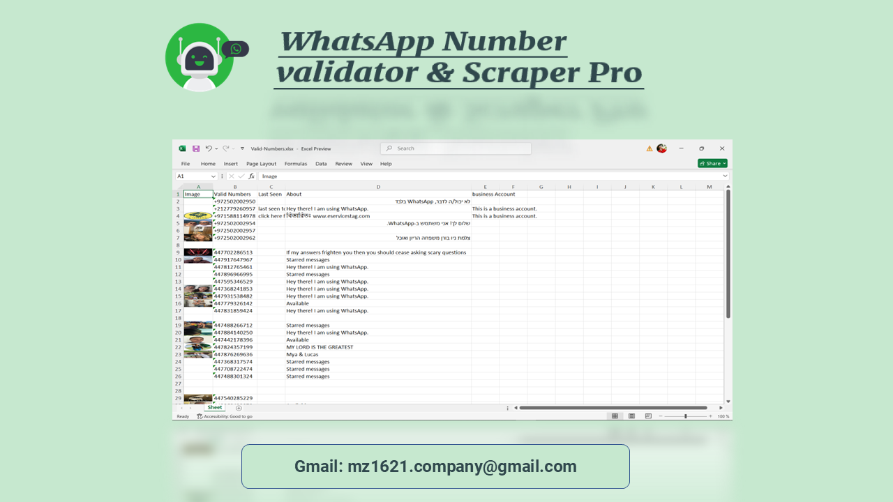 ⭐ Validate Any Number. ⭐ Validate Saved/Unsaved Number ⭐ Scrape Name(New) ⭐ Scrape Image(New) ⭐ Scrape Valid Numbers ⭐ Scrape Last Seen (New) ⭐ Scrape About(New) ⭐ Scrape Business Account(New) ⭐ Download Images With Number Name ⭐ Export Result In Excel ⭐ Export Business Numbers In Txt ⭐ Export Regular Numbers In txt ⭐ Support Chrome & Firefox. ⭐ Fast and good Support