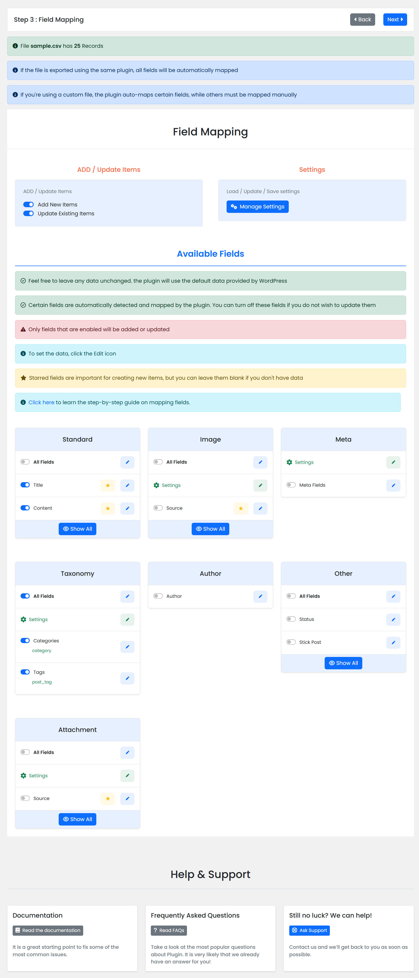 - New add-ons: Rank Math SEO - New add-ons: All in One SEO - New add-on: Google Cloud Storage - New feature: Auto-detect content type - New feature: Auto-detect same-name files for easy reimport - New feature: Auto-detection in field mapping - New feature: Auto-detect searching of existing items - New feature: Manage file security - New feature: Improved debugging capabilities - Improvements: Manage log files - Improvements: Additional data filter options - Improvements: Easier field management with categorized fields