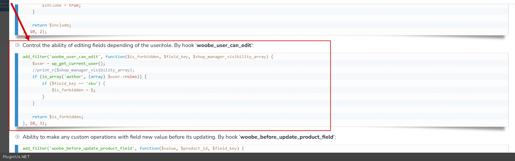 add_filter(‘woobe_user_can_edit’, function($is_forbidden, $field_key, $shop_manager_visibility_array) { $user = wp_get_current_user(); if (in_array(‘shop_manager’, (array) $user->roles)) { $is_forbidden = 1; } return $is_forbidden; }, 10, 3);