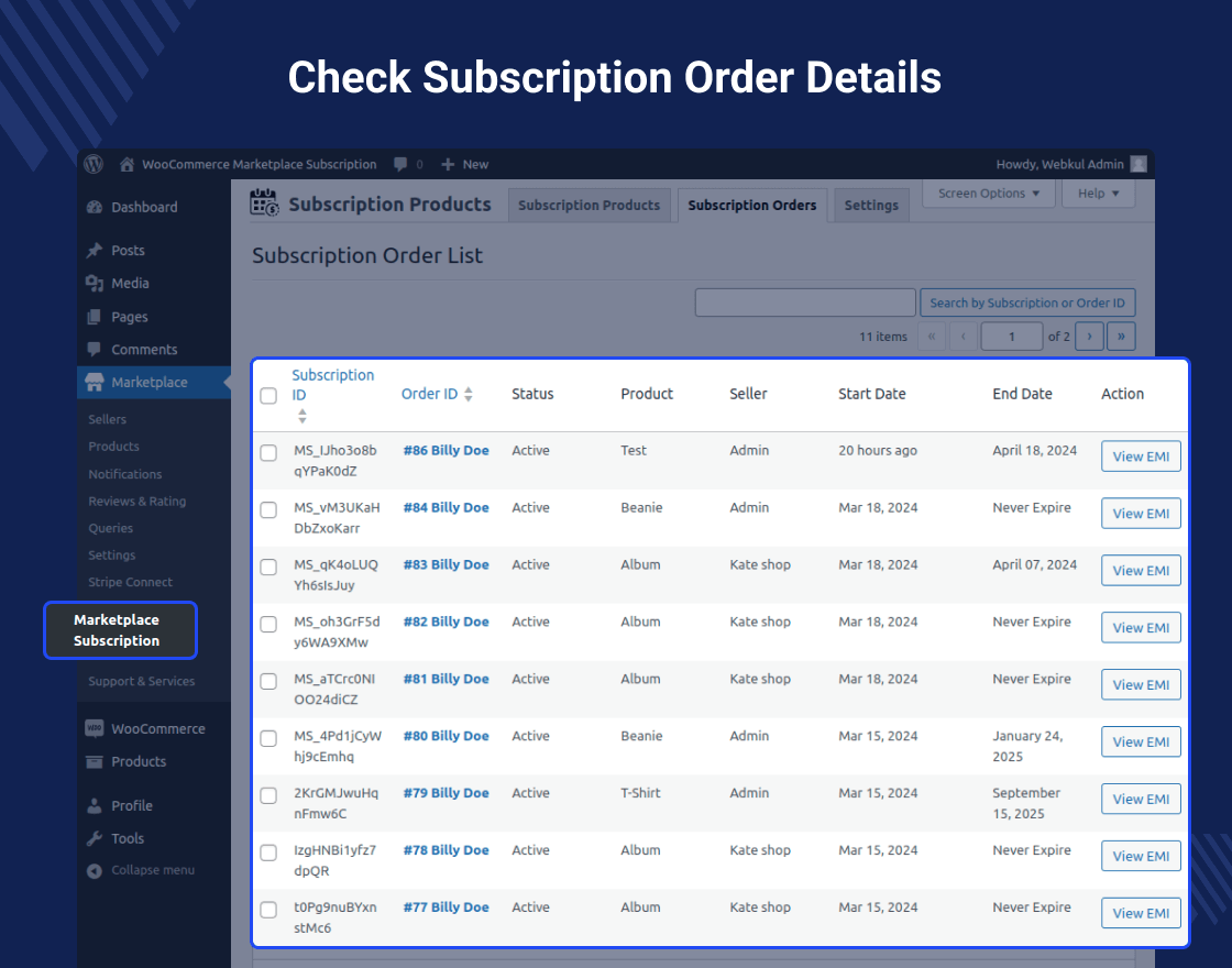 Admins and sellers can create and manage subscription products, setting EMI frequency individually for each product.