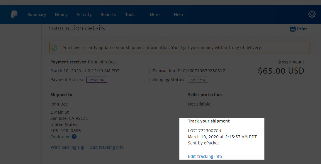 - Automatically add shipping information: Shipping information including the carrier name, tracking number, and shipment status will be added to your Paypal transaction details automatically.
