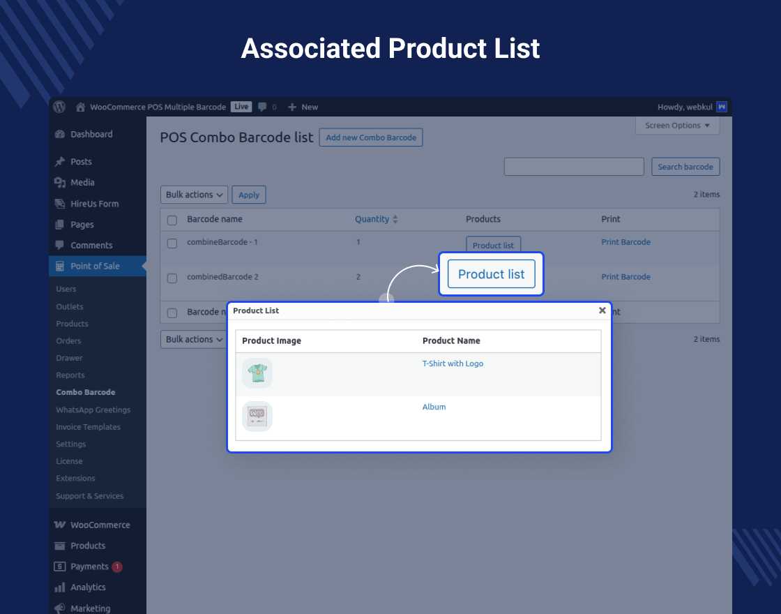 With the help of WooCommerce POS Configurable Barcode Plugin, the admin can create multiple barcodes for a product and assign them with multiple quantities.