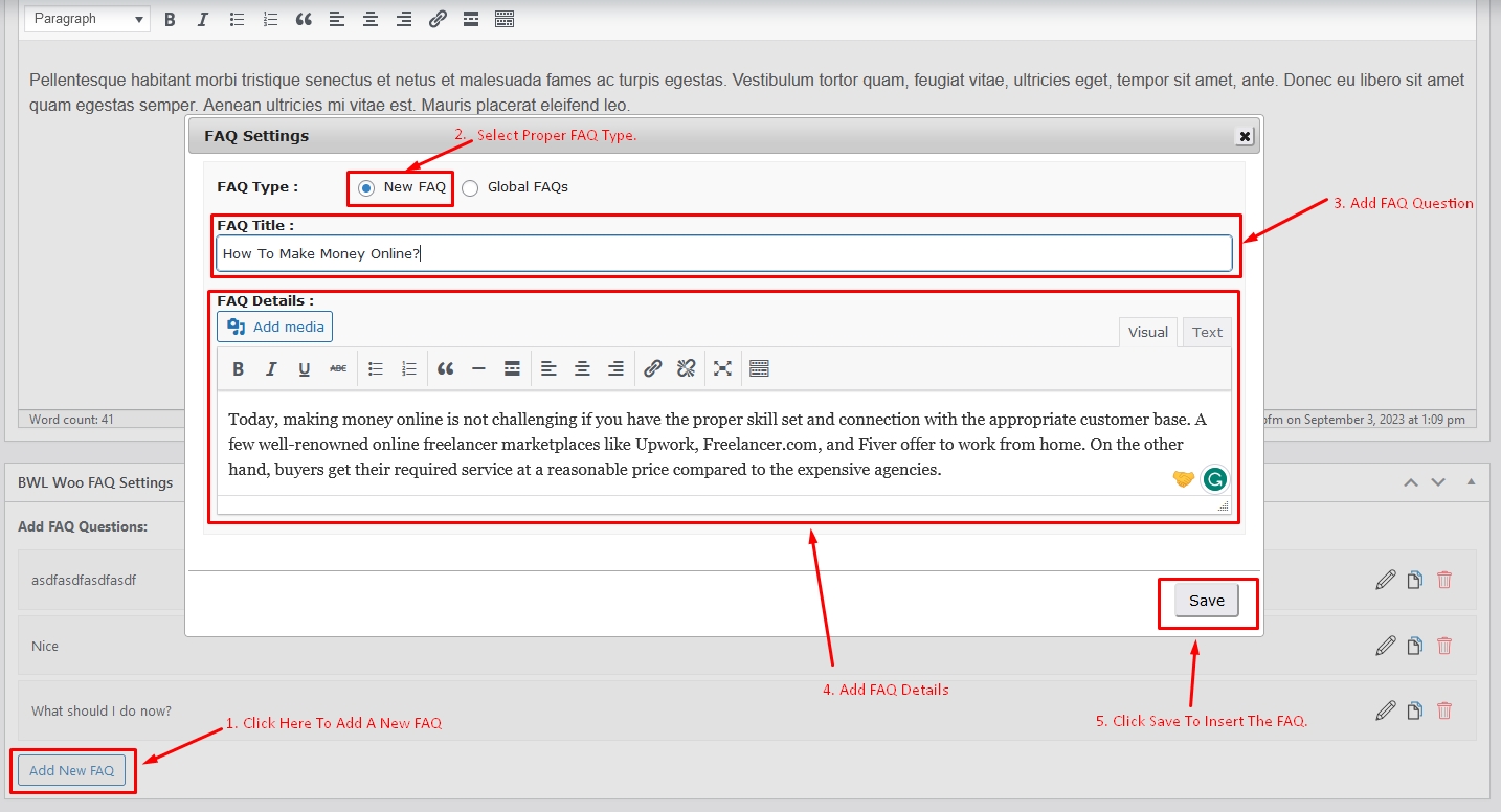 Allow you to create common FAQs like – contact information, Refund policy and use them in to all product FAQ section.