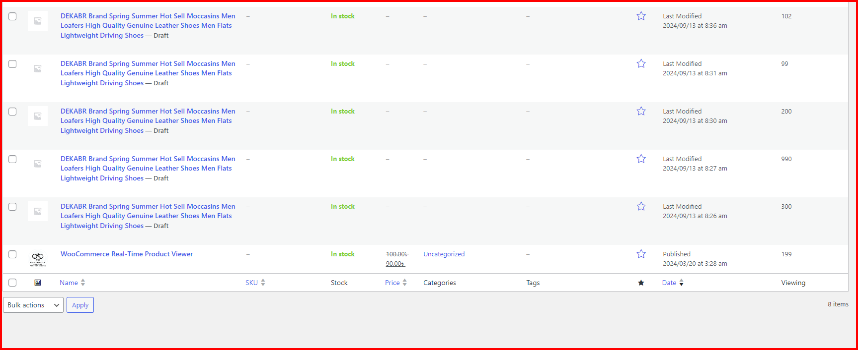 - The plugin adds a custom column labeled “Viewing” in the WooCommerce product list, displaying how many users are currently viewing each product.