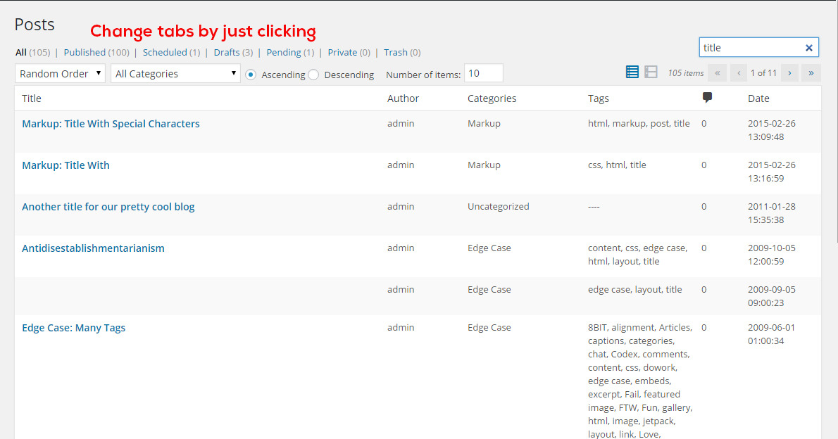 - Sorting related to Titles, Comments, Authors, Tags and Categories