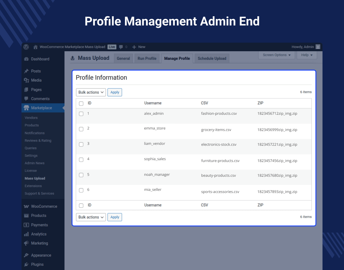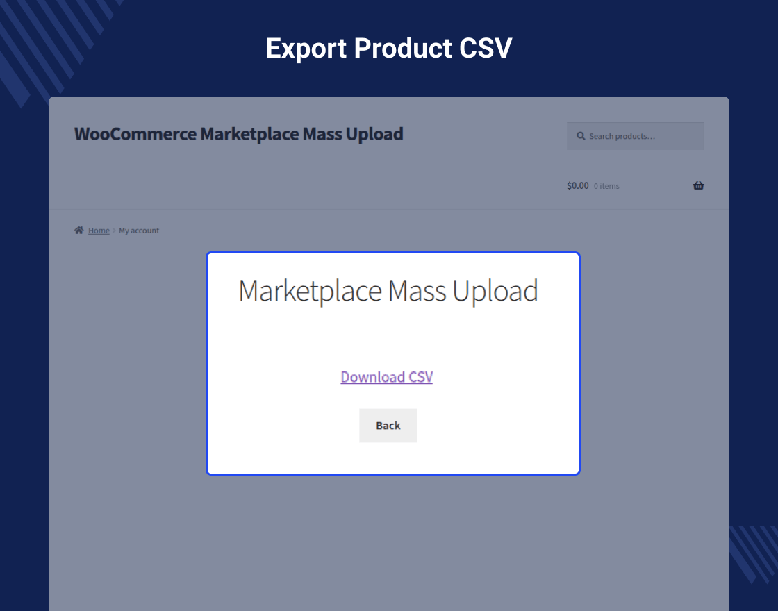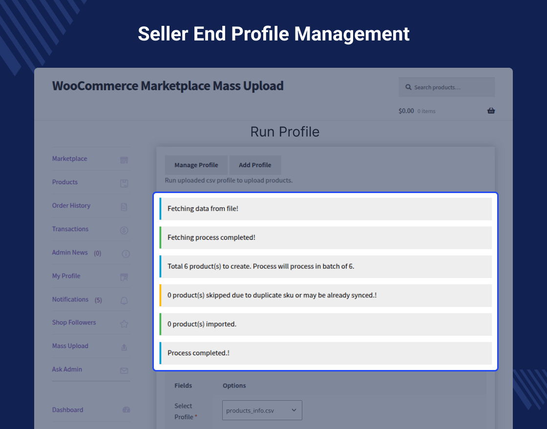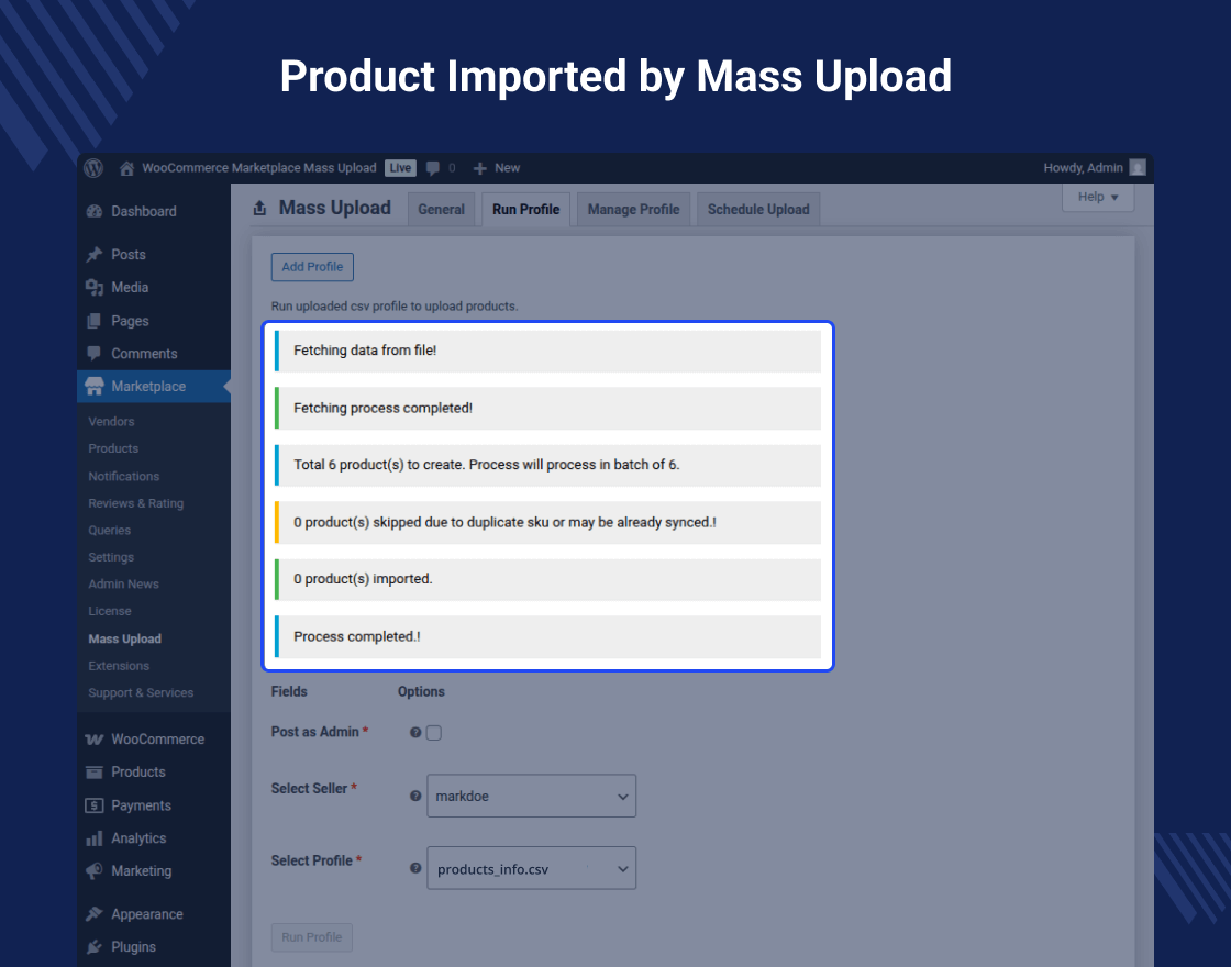 By using WordPress WooCommerce Marketplace Mass Upload the seller of the marketplace can bulk upload products. The seller can upload the bulk products from his seller account using a CSV file. Even the admin of the marketplace can bulk upload products into the seller account using CSV files.