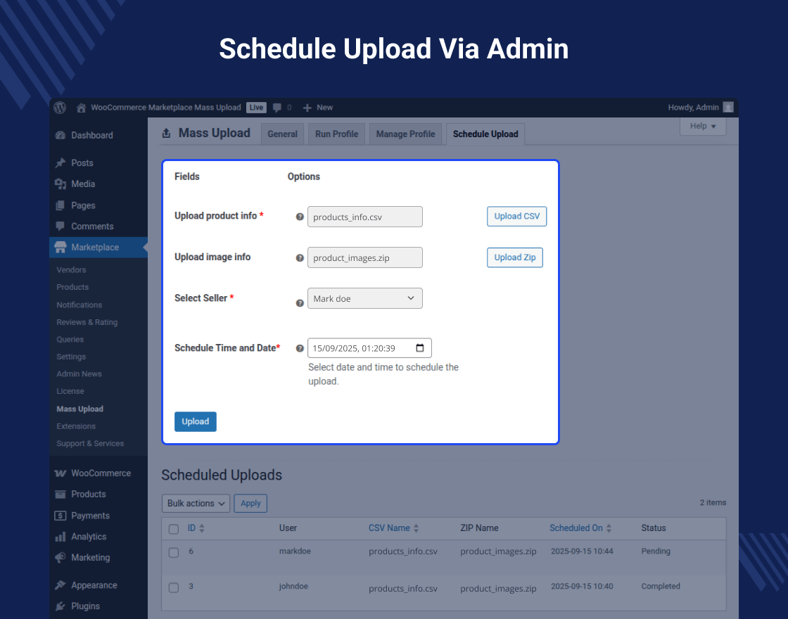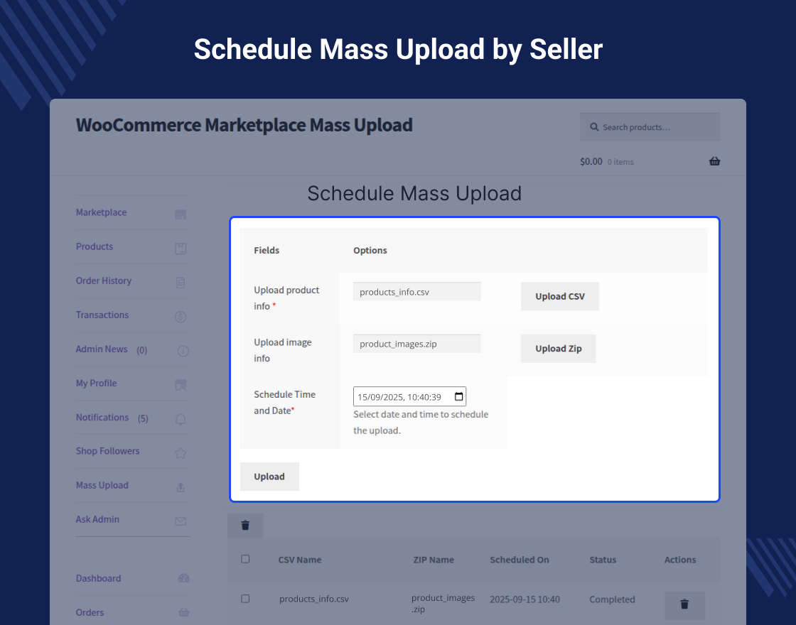 v 3.2.0 (2025-09-15) Fixed: Security issues. Added: Feature Where Mass Upload could be execute on Scheduled Time and Date by both Admin and Seller. Added: Table where you can see the details and status of scheduled mass uploads. Added: Compatibility with WooCommerce Cart and Checkout blocks. Update: Compatible with WooCommerce 10.1 version. Update: Compatible with WordPress 6.8 version. Optimized: Scripts and styles for faster loading