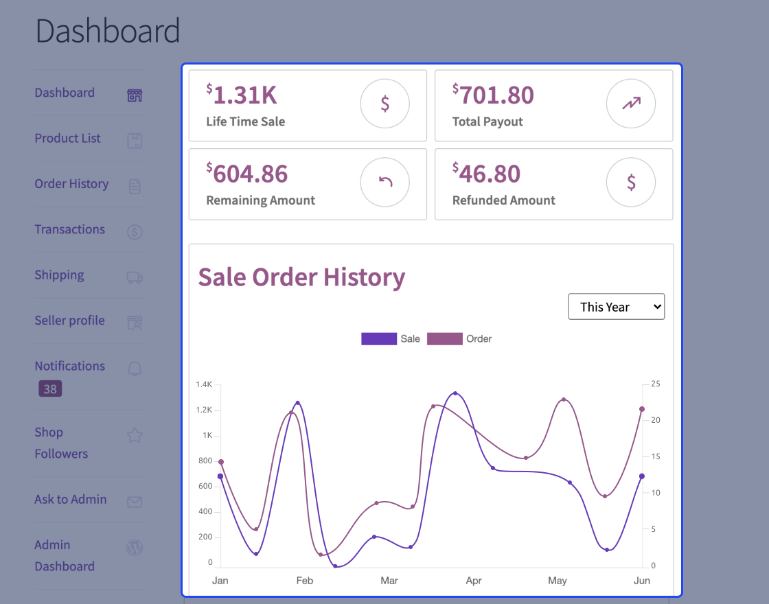 The WordPress WooCommerce Multi Vendor Marketplace Plugin converts your e-commerce store into a fully functional marketplace having multiple sellers with separate seller profiles and gives sellers the functionality of adding the products from the seller panel. Using this plugin the seller can view and edit his profile information. He can view his product list and search, edit or delete products from it. The seller can view a record of his transactions and sales charts on his dashboard. He can view his order history for all the orders, change his password and even ask questions to the admin.