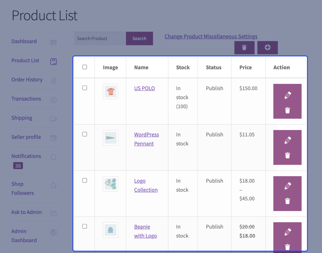 The admin can also manage the product list, seller list, commissions, and settings. Admin can edit or delete products, approve, disapprove or assign sellers to products, set separate commission rates for different sellers and can change settings like product auto-publish and seller auto-approval permissions.