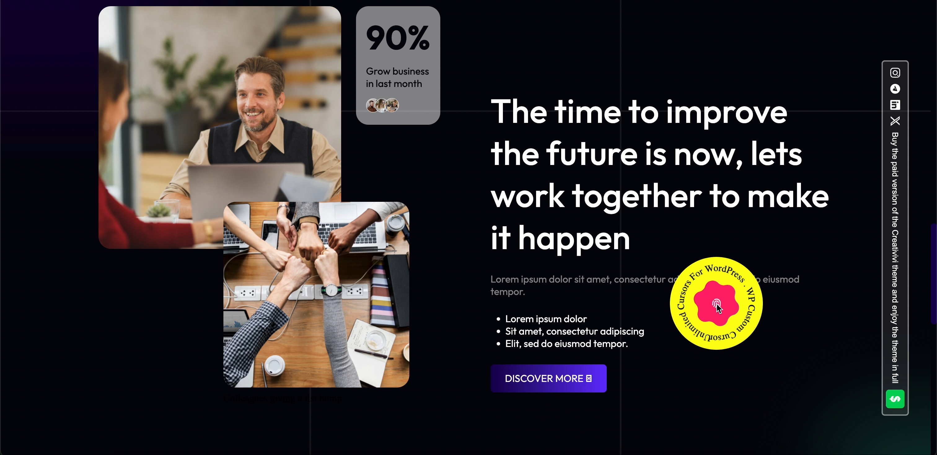 But that’s not all! Elevate your website’s dynamism with hover cursors that captivate attention on every interaction. Engage your audience like never before as they glide through your content with a cursor that mirrors your brand’s personality.