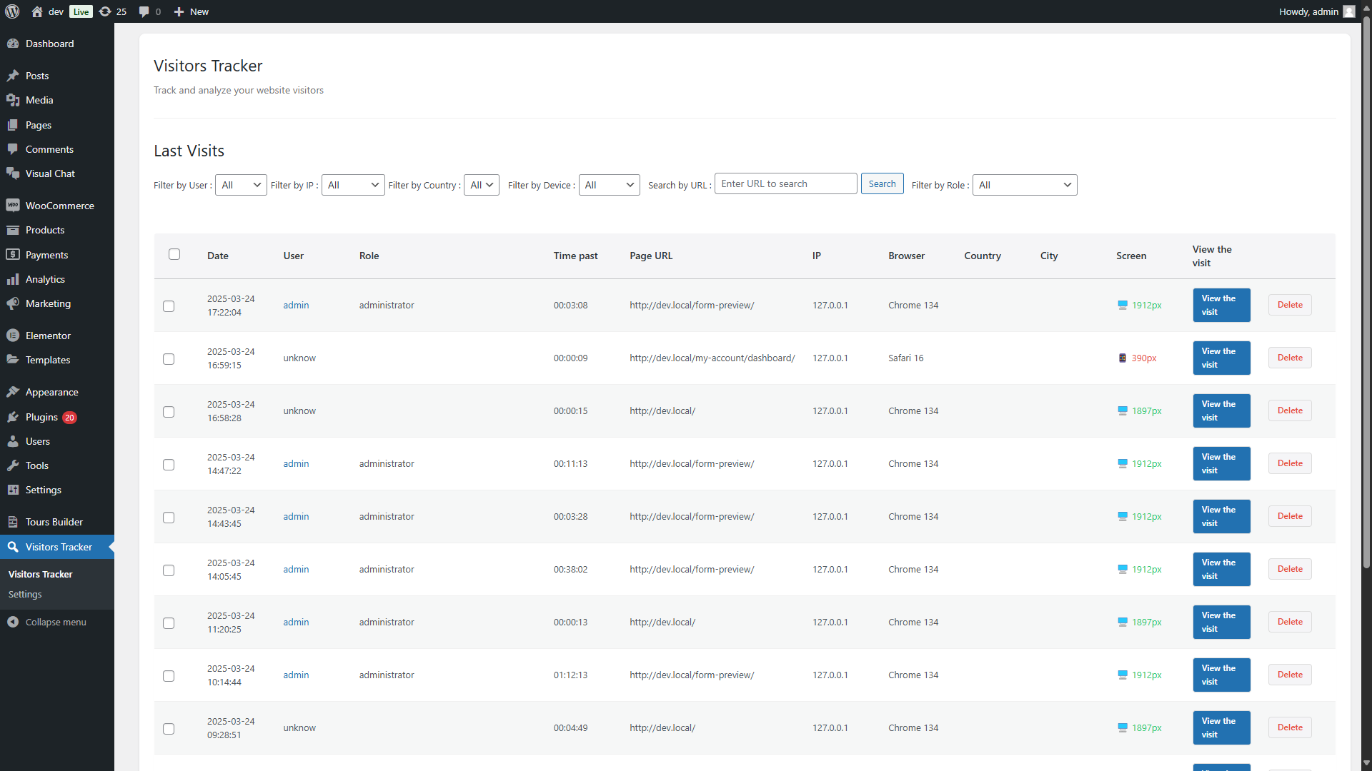 - Click on the “Visitor Tracker” menu link to view the visits list