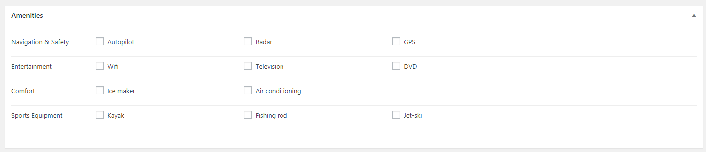 You can define an unlimited amenities via setting panel like navigation & safety group (Autopilot, radar, GPS,...), entertainment group(Wifi, Television, DVD, ...), sport equipment group (Kaya, Fishing rod, Jet-ski,...), ... and then you can assign them to individual yacht and boat.Rental period ranger, Price Period ranger