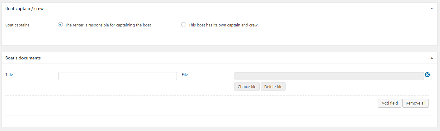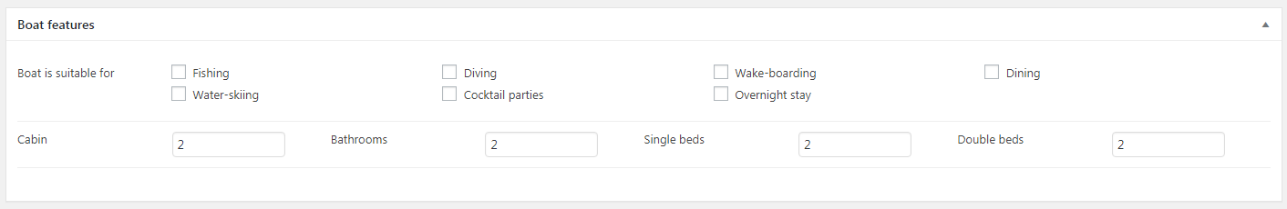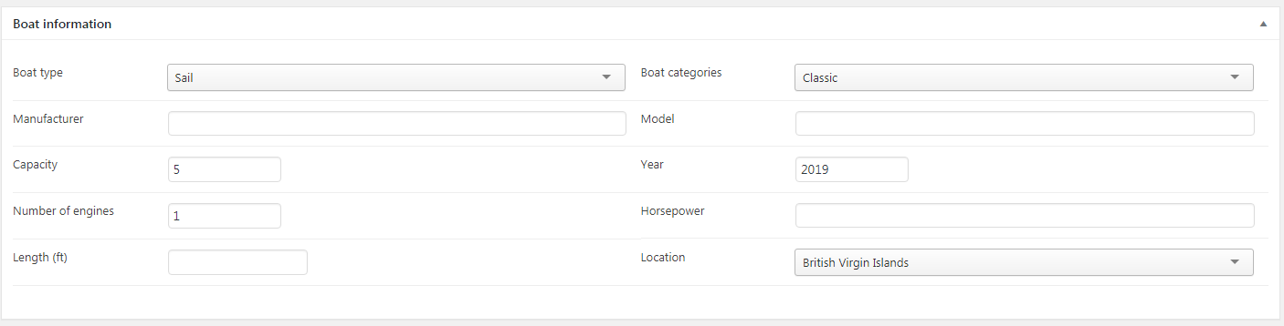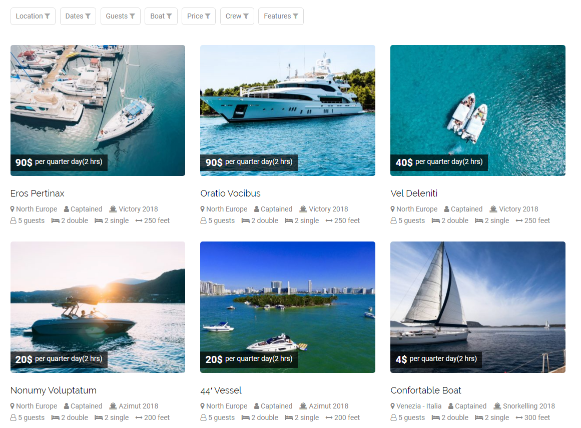 You can define an unlimited number of yacht and boat. Set yatch, boat infromation, manufacture, model, gallery image. Assign a yacht and boat to the location, enter number of seats, number of cabin, single bed, double bed. Enter the type of yatch or boat, fuel policy, captain/crew . Defined price of rental per quater day, per hafl day, full day or weekly, select number of payments (Full charge at purchase time or two times). You can even specify the dates in which the yatch or boat is not available. Attach document about yacht and boat if haveAmenities